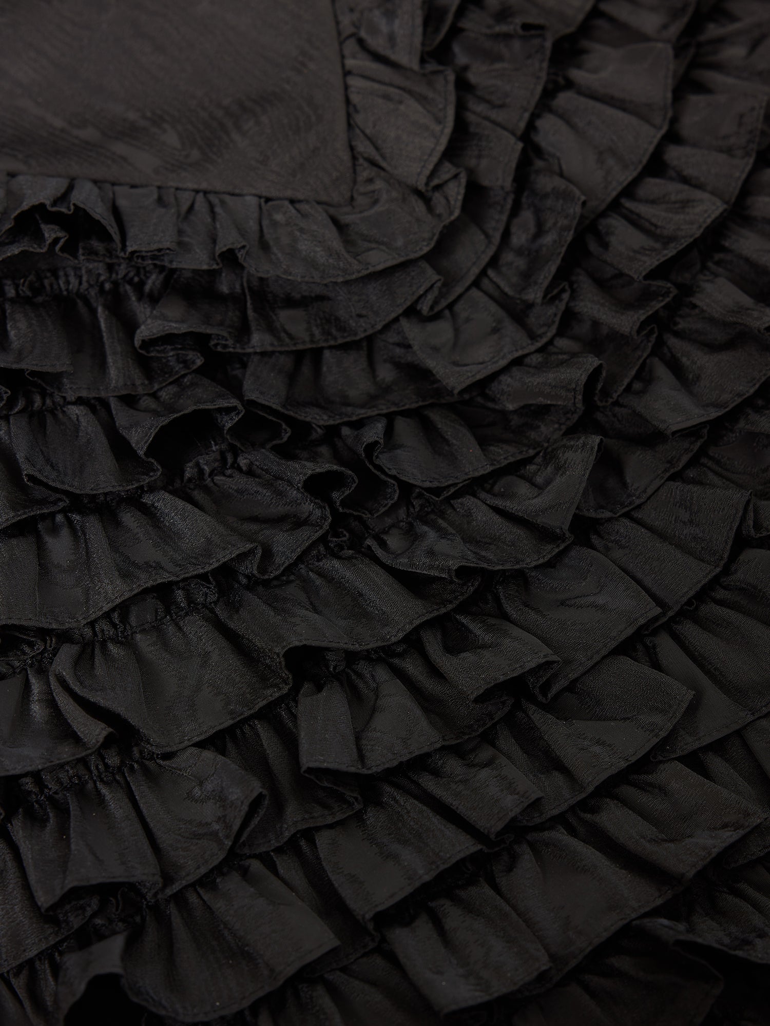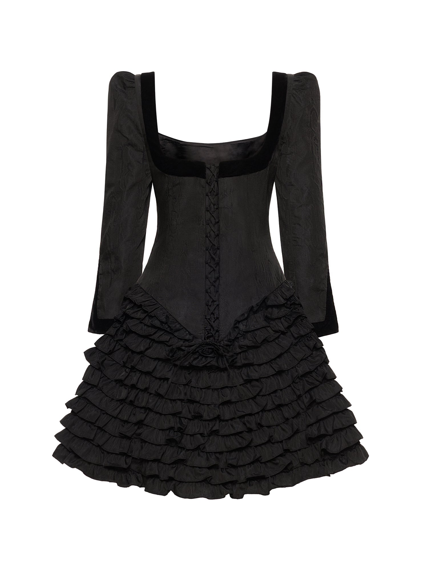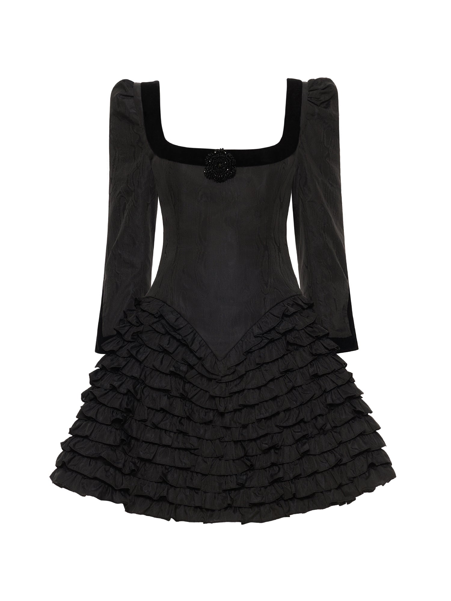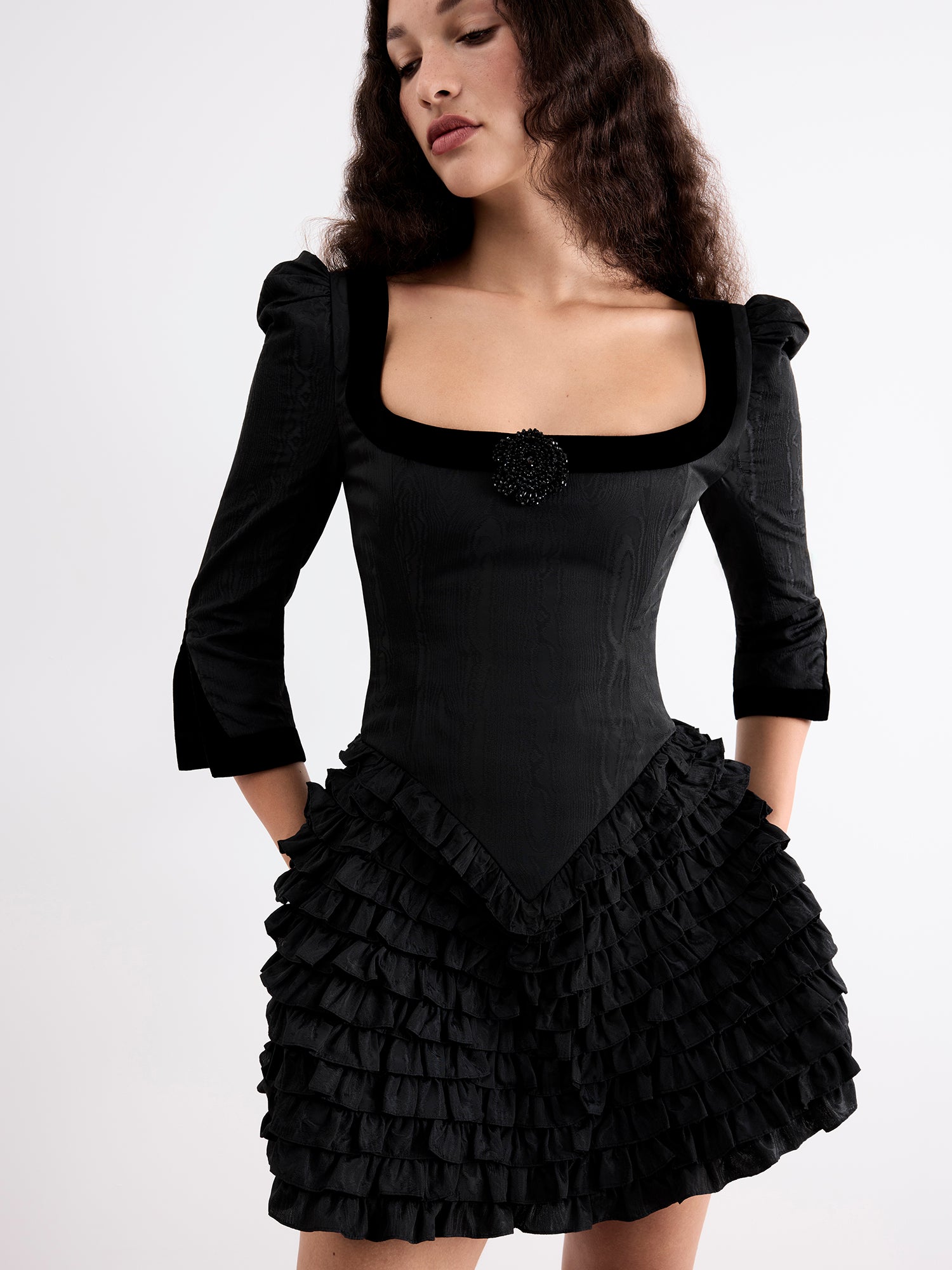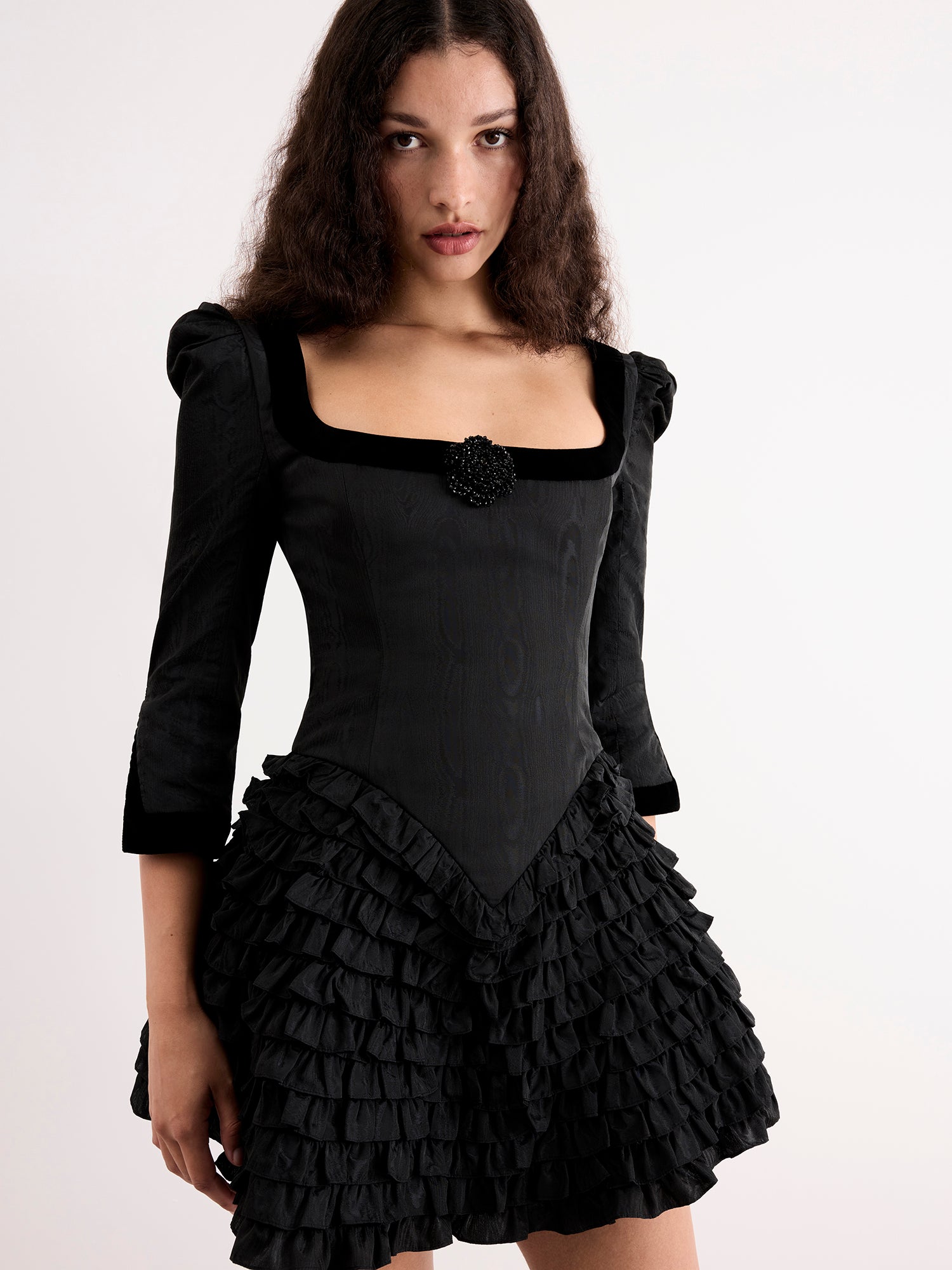 Drawing inspiration from the poise and sculptural silhouettes of the stage, the Ballerina Mini Dress features a figure-defining corset in sumptuous moire taffeta contrasted with a voluminous ruffled mini skirt. Finished with three-quarter sleeves trimmed in velvet and accented with a hand-beaded floral embellishment at the neckline, the Ballerina mini dress is a statement of refined glamour.
