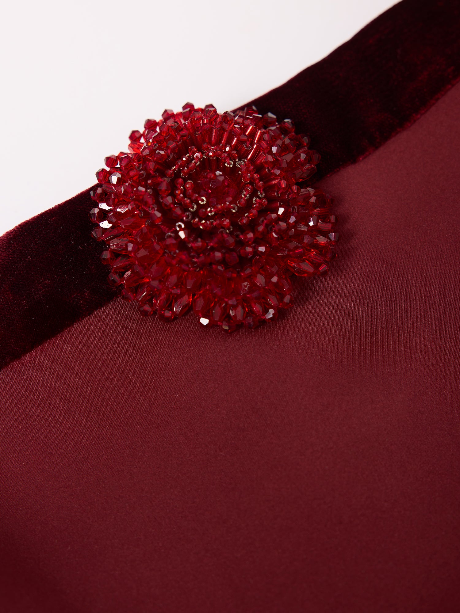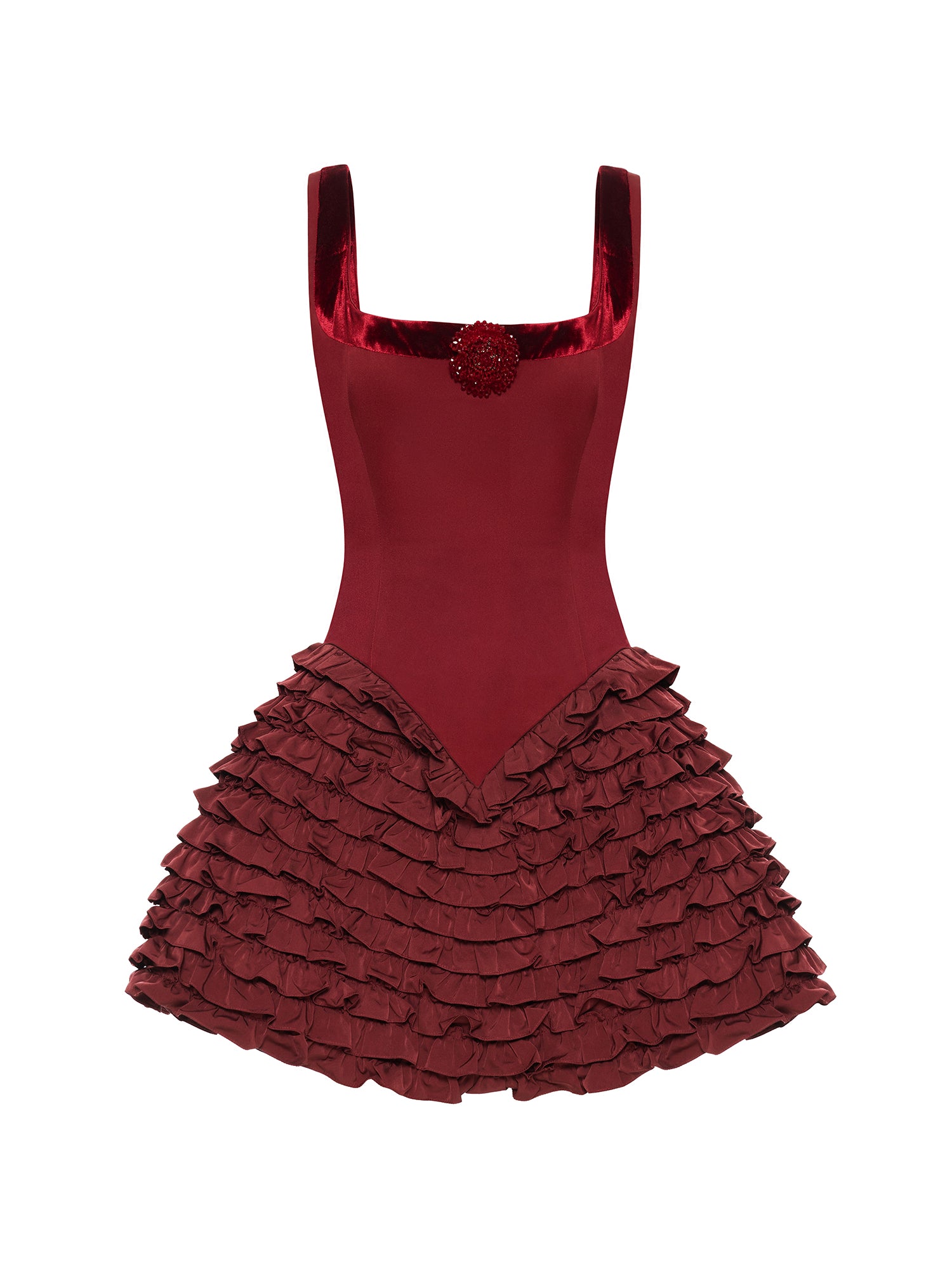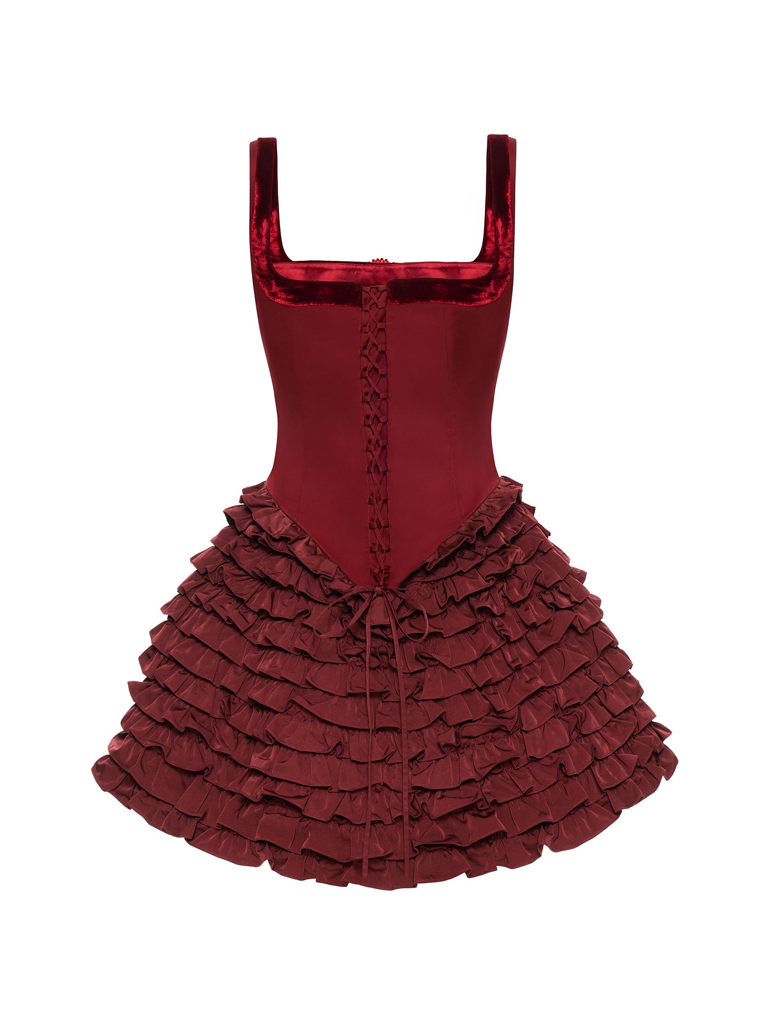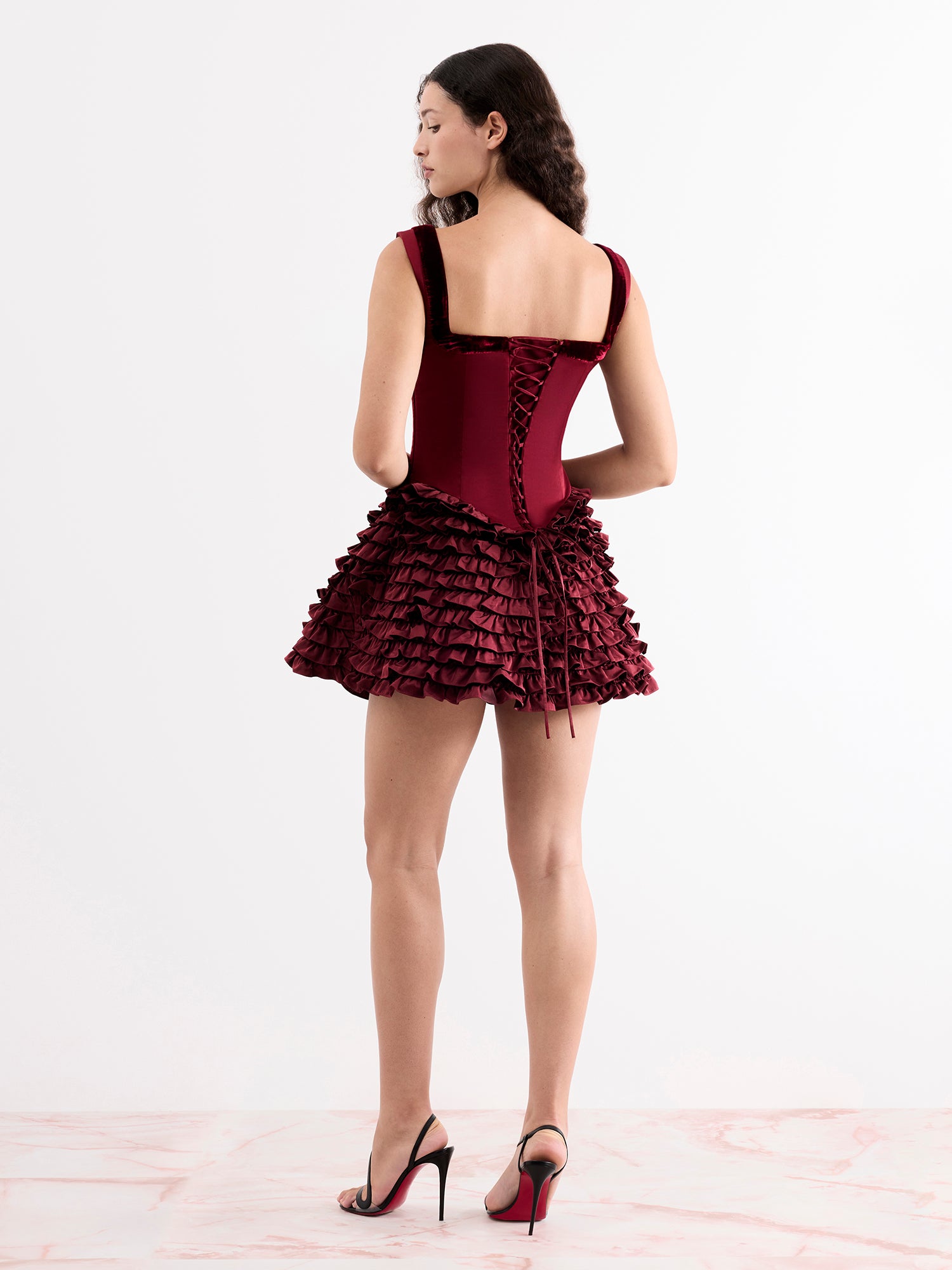 The Ballerina Mini Dress in rich Cabernet strikes the perfect balance between structure and drama. The taffeta mini dress features a figure-sculpting corset, contrasted with a voluminous ruffled mini skirt. A flattering square neckline with an elevated velvet trim and hand embellished floral accent, the dress cuts a bold and effortlessly feminine silhouette.