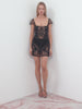 Introducing the Cora Mini Dress. Crafted from sheer soft tulle, this elegant piece is delicately embellished with intricate dazzling details. Look closely, and you'll discover hidden fairy motifs nestled among swirls of hearts and delicate bows, adding a touch of magic to the design. The Cora Mini Dress is hand crafted by our artisan makers with custom lace motifs hand-drawn by Clio that decorate the body.