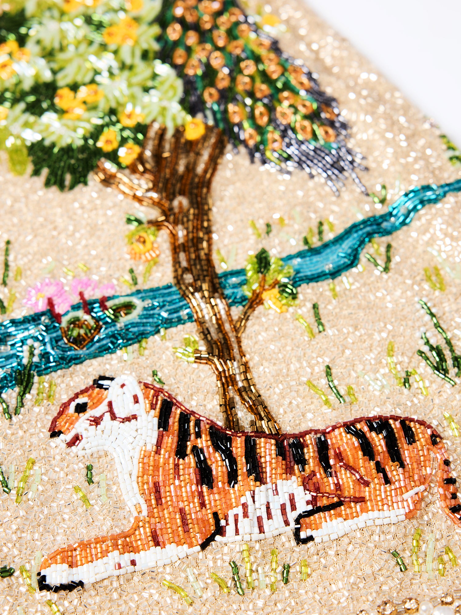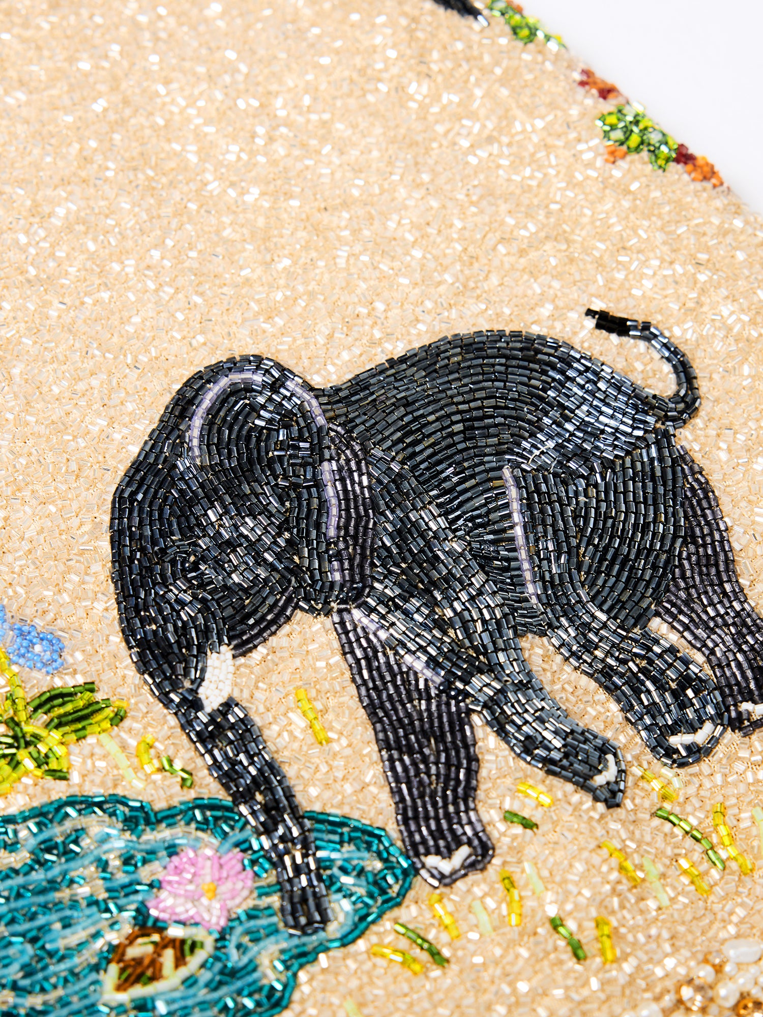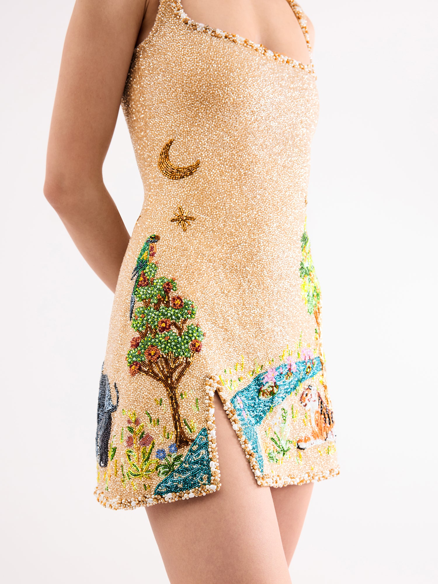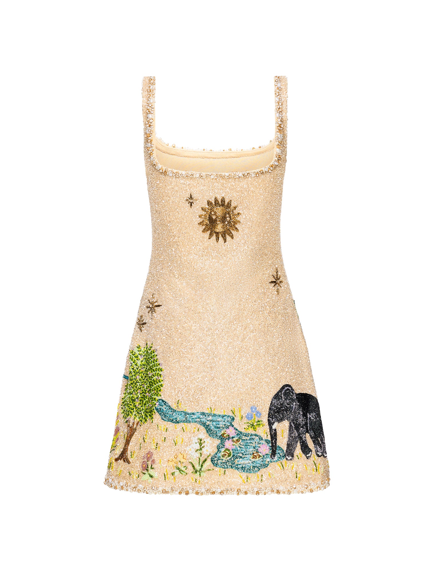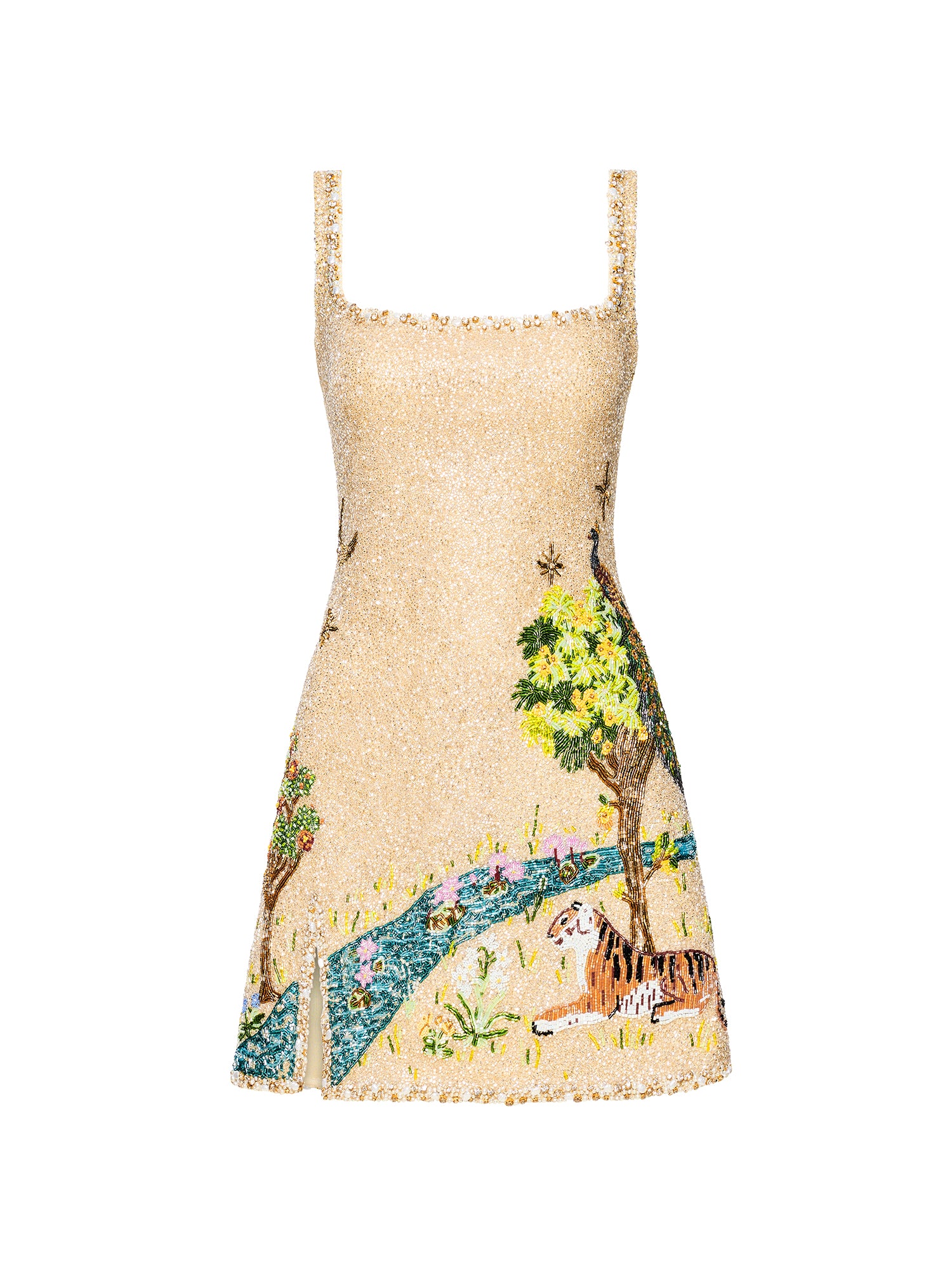 A postcard from India, this captivating dress celebrates the opulence, artistry, and cultural beauty from a country which is so integral to the Clio Peppiatt brand story. Adorned with intricate hand embellishments which depict a sleeping tiger, regal peacock perched in a tree, rivers full of water lilies, an elephant and mango trees, all of which are inspired by the vibrant spirit and natural beauty of India. Designed to flatter and move with your body, the India Dress is made from our classic stretch fabric that perfectly shapes and sculpts your body.
