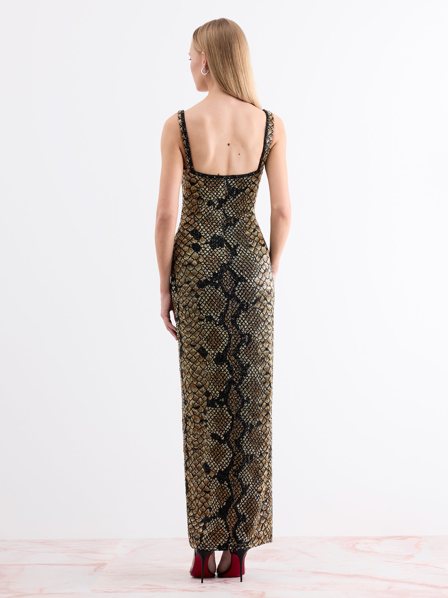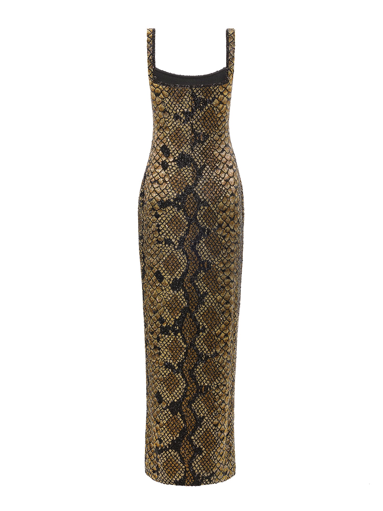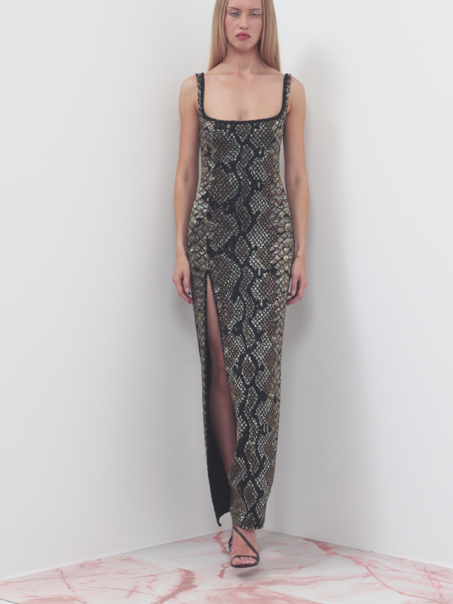 The Medusa dress' detail is breath-taking, featuring an all-over beaded snakeskin embroidery which appears like sparkling scales. On our classic stretch fabrication, which sculpts the flatters the body, the dress has a dramatic thigh high split encrusted with beads. A piece with undeniable magnetic energy, the Medusa is an ode to modern Hollywood allure.