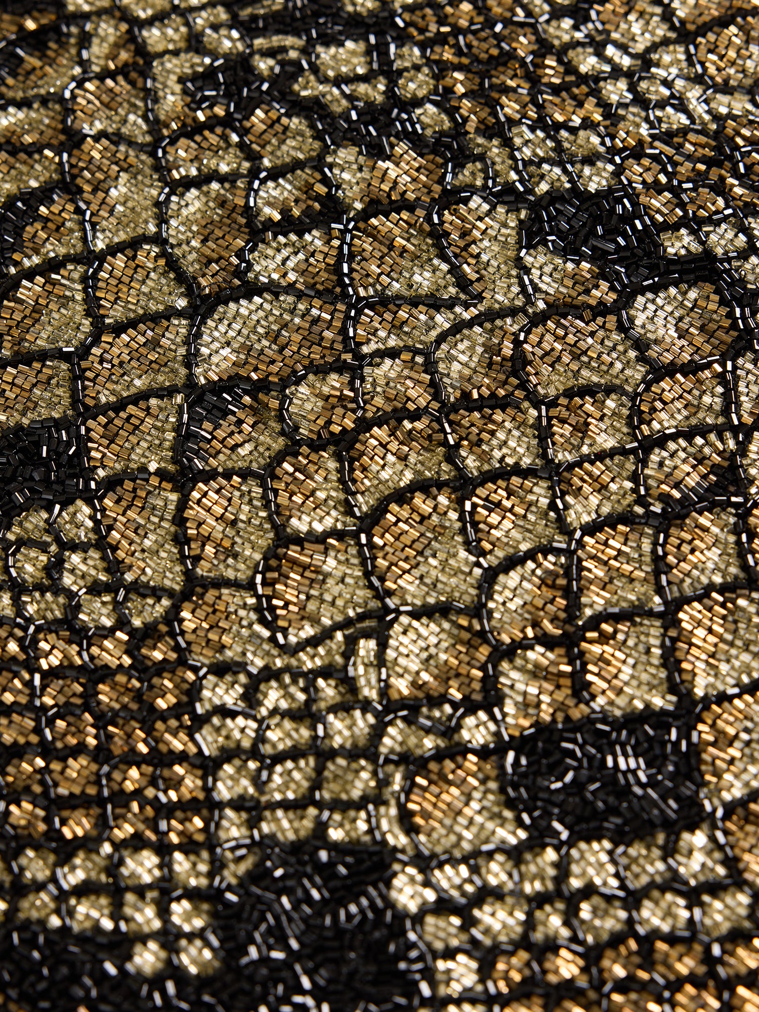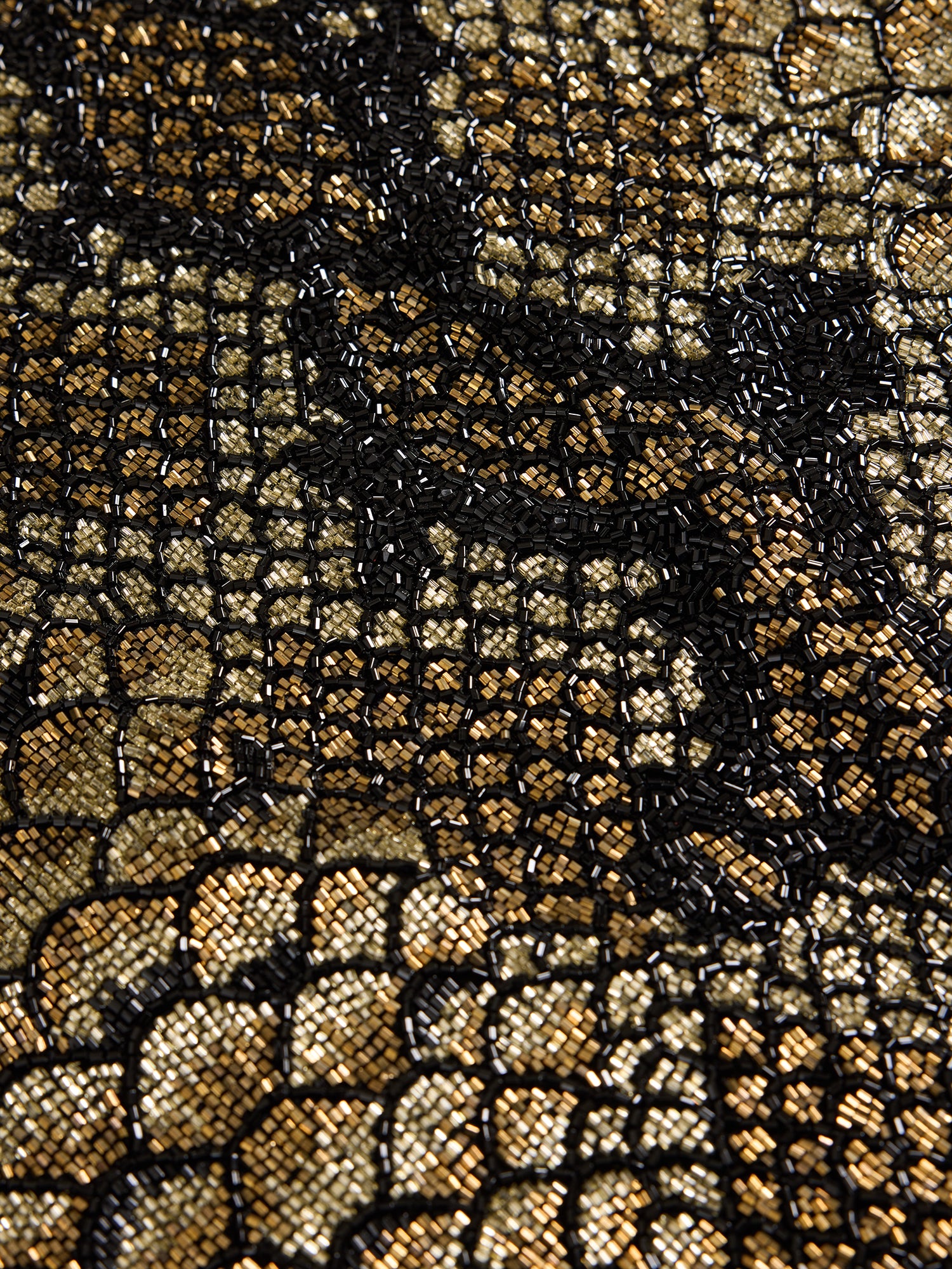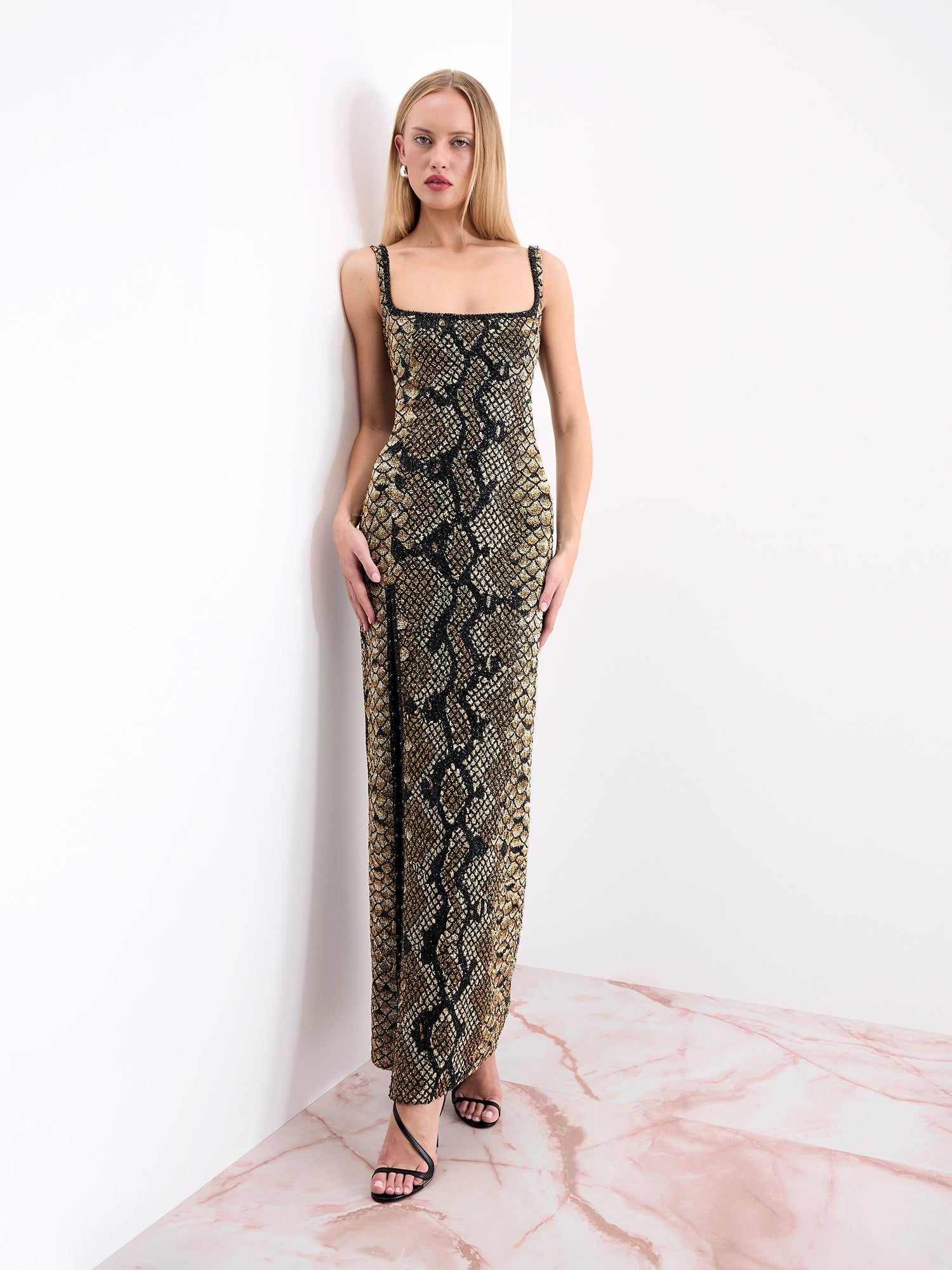 The Medusa dress' detail is breath-taking, featuring an all-over beaded snakeskin embroidery which appears like sparkling scales. On our classic stretch fabrication, which sculpts the flatters the body, the dress has a dramatic thigh high split encrusted with beads. A piece with undeniable magnetic energy, the Medusa is an ode to modern Hollywood allure.