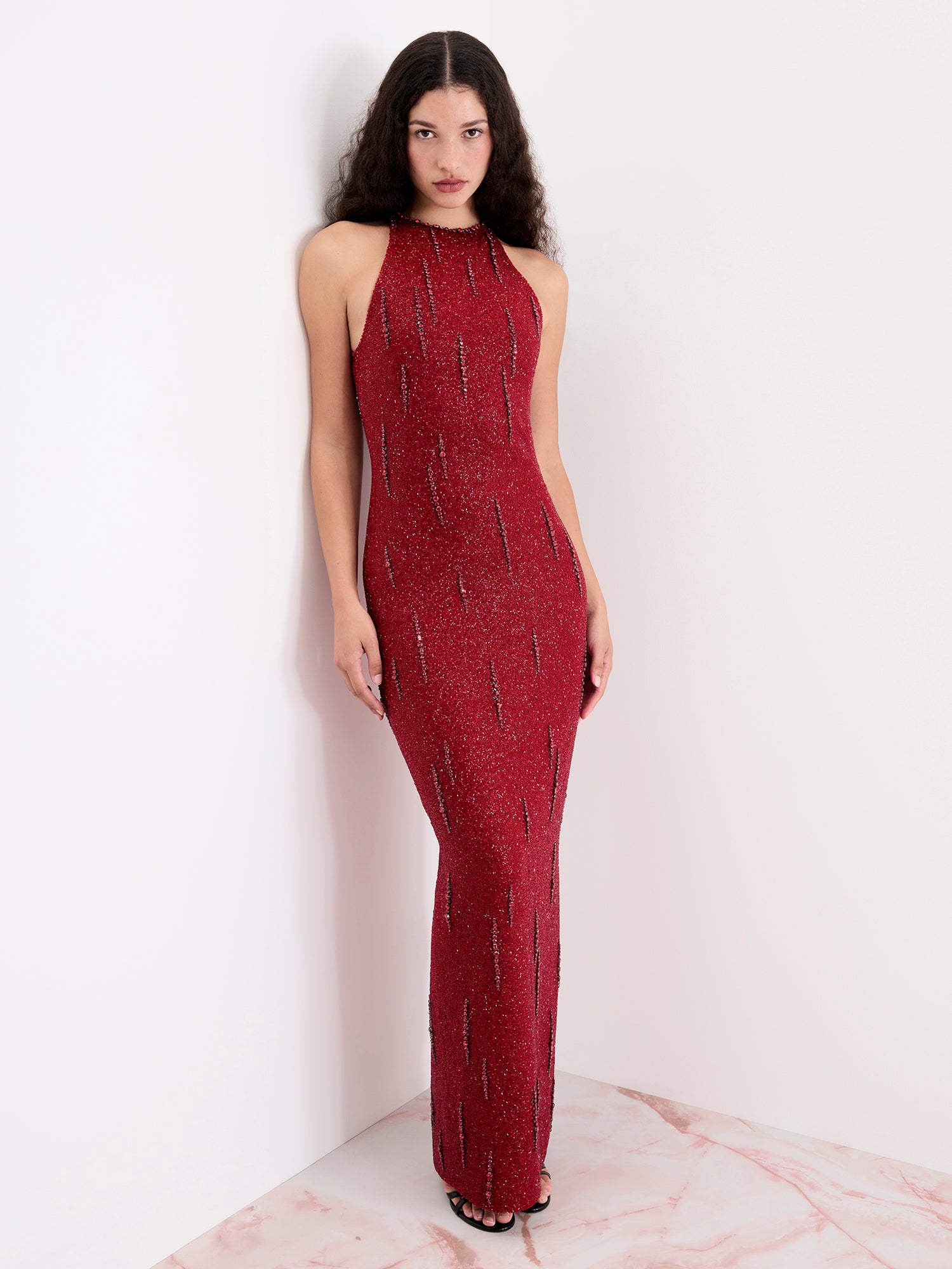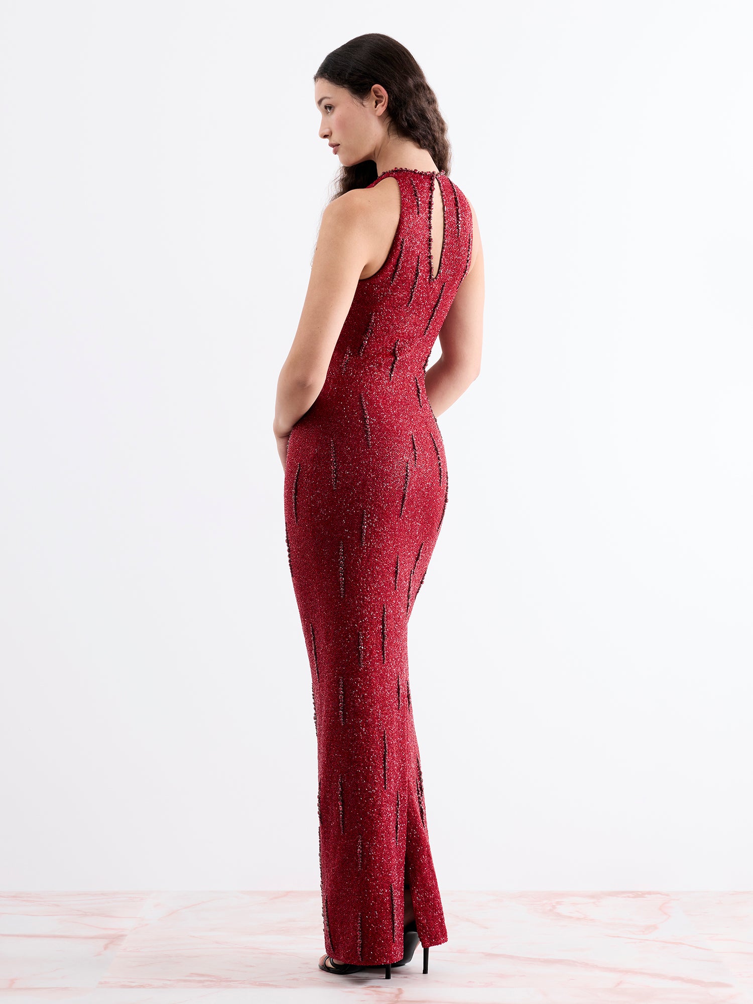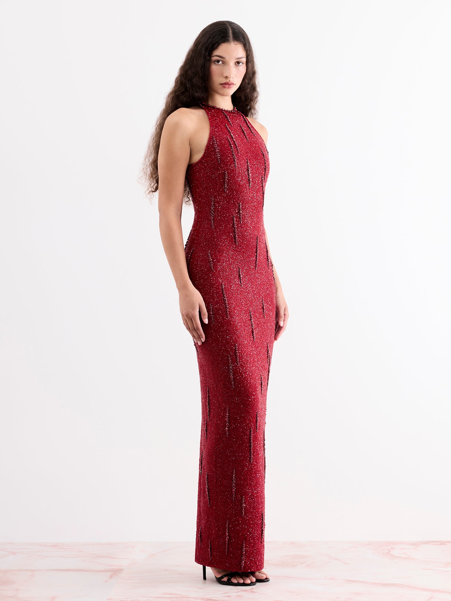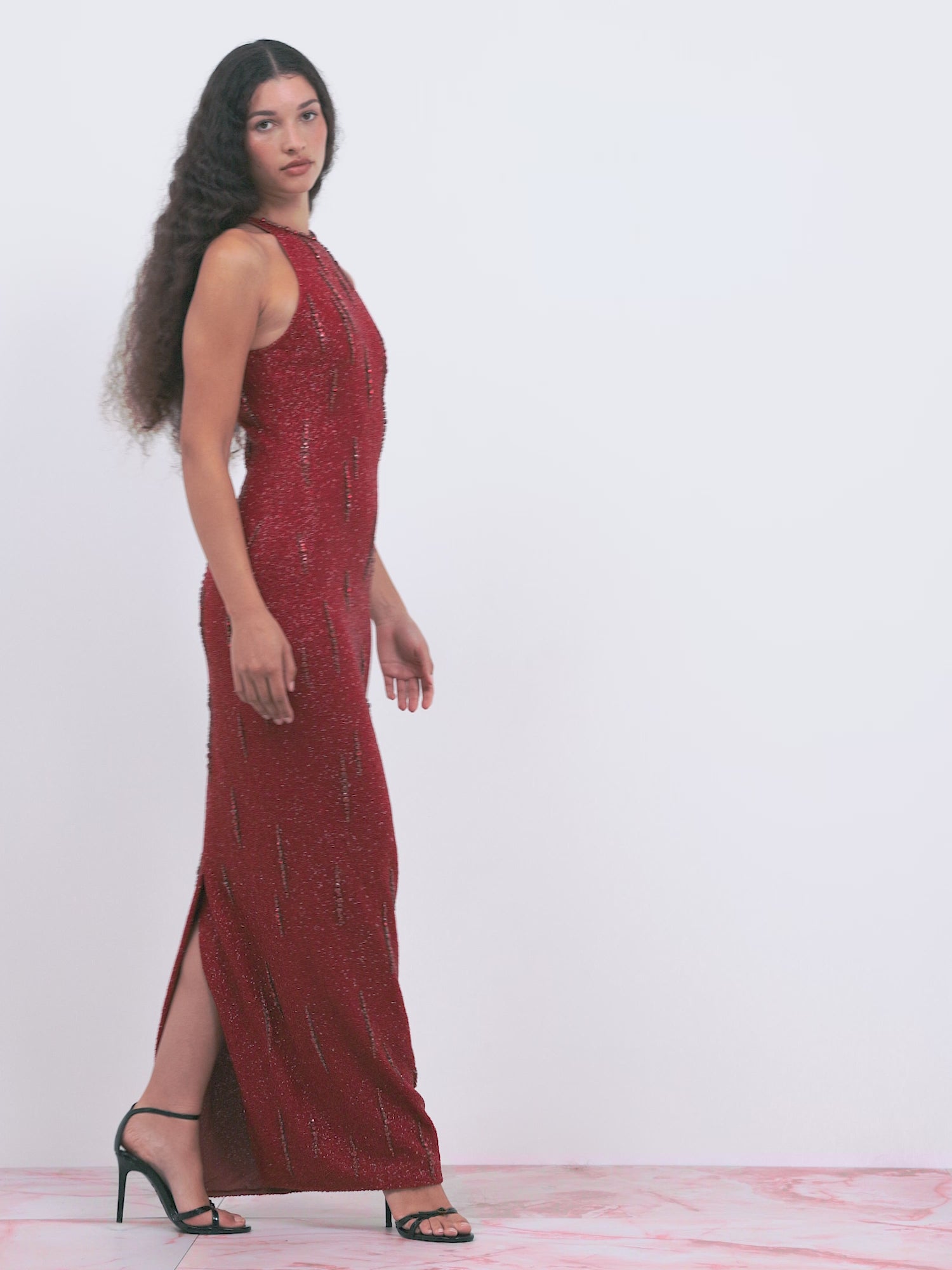 The Mimosa Dress, in a rich cabernet hue, is adorned with crystal embellishments that cascade down the body, catching the light with every movement. A high neckline and sleek, elongated silhouette create a statuesque effect, balancing timeless sophistication with modernity.