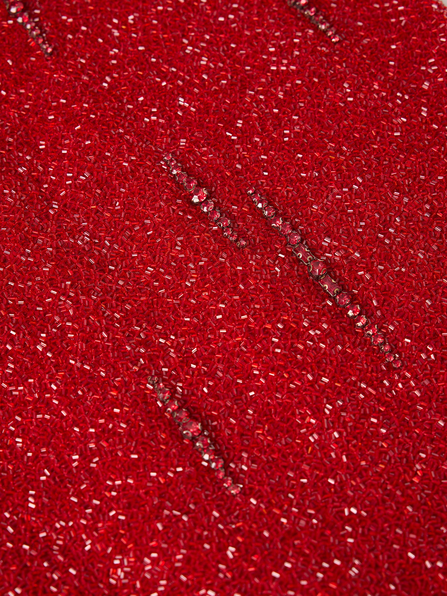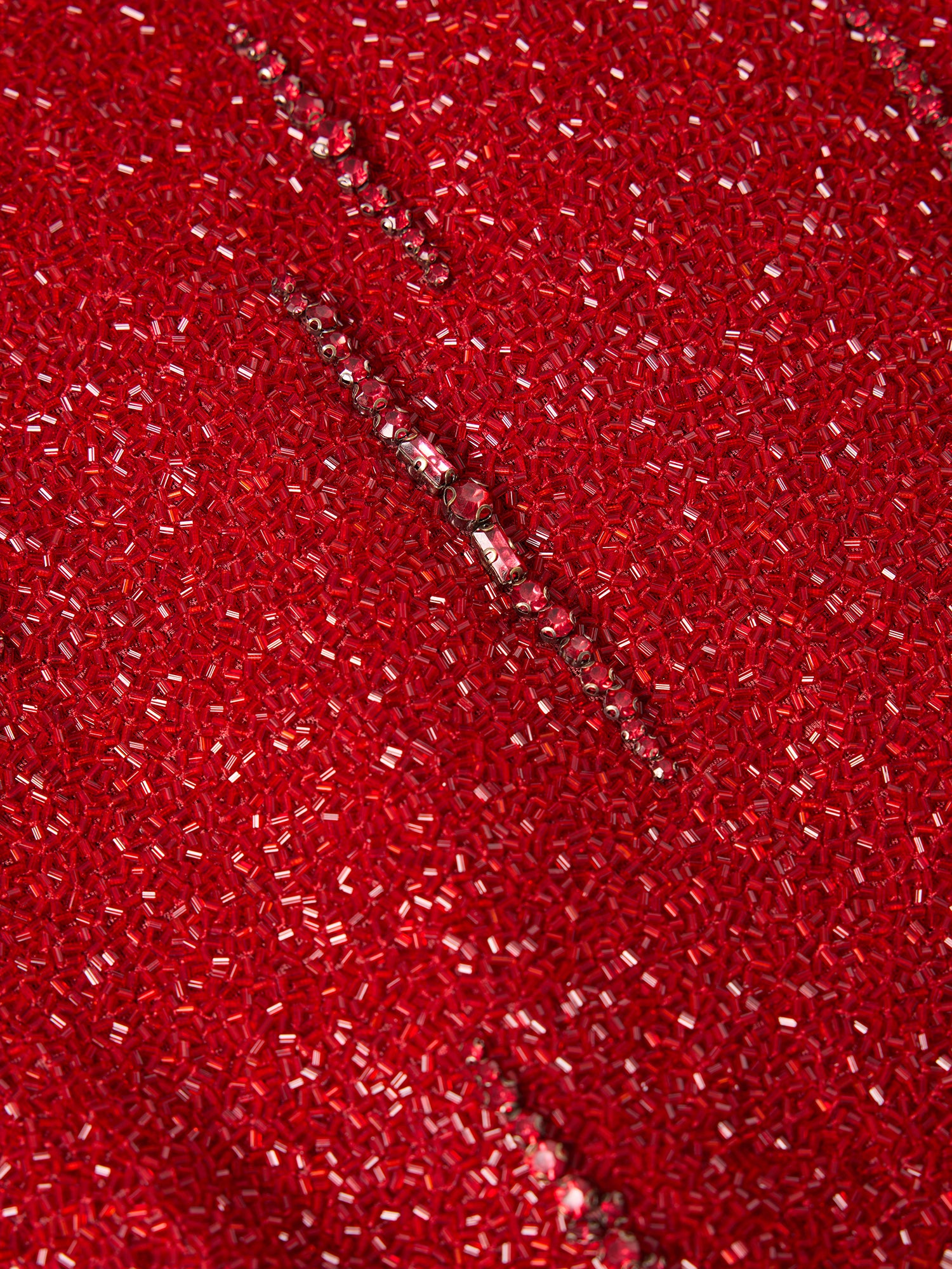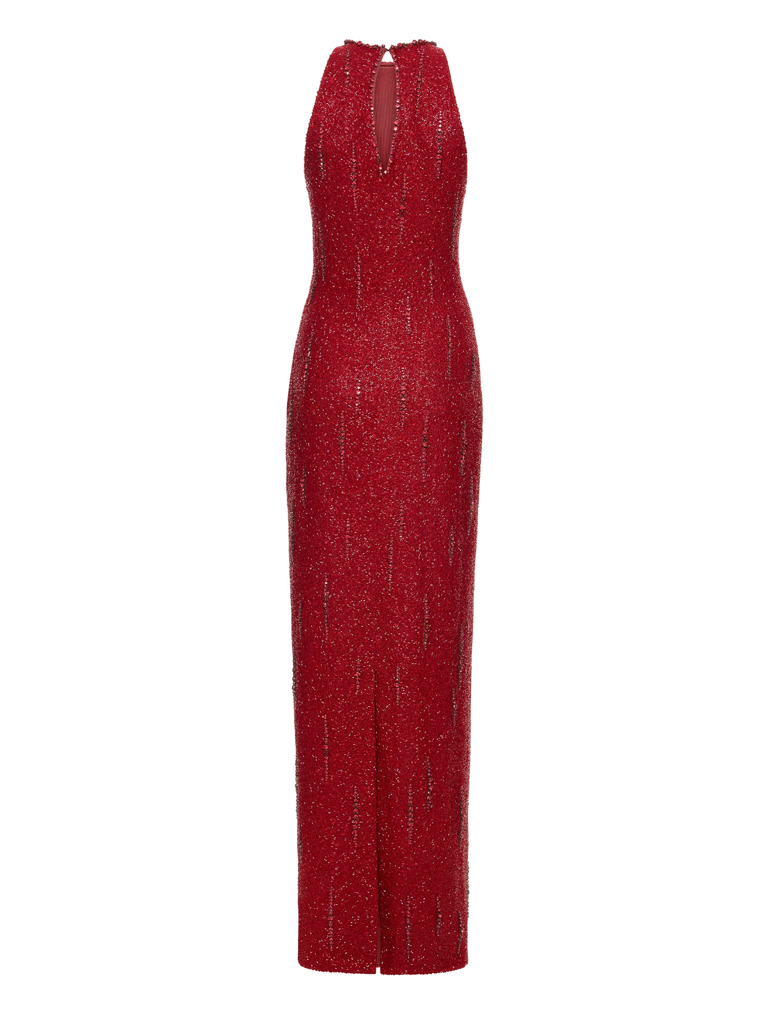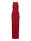 The Mimosa Dress, in a rich cabernet hue, is adorned with crystal embellishments that cascade down the body, catching the light with every movement. A high neckline and sleek, elongated silhouette create a statuesque effect, balancing timeless sophistication with modernity.