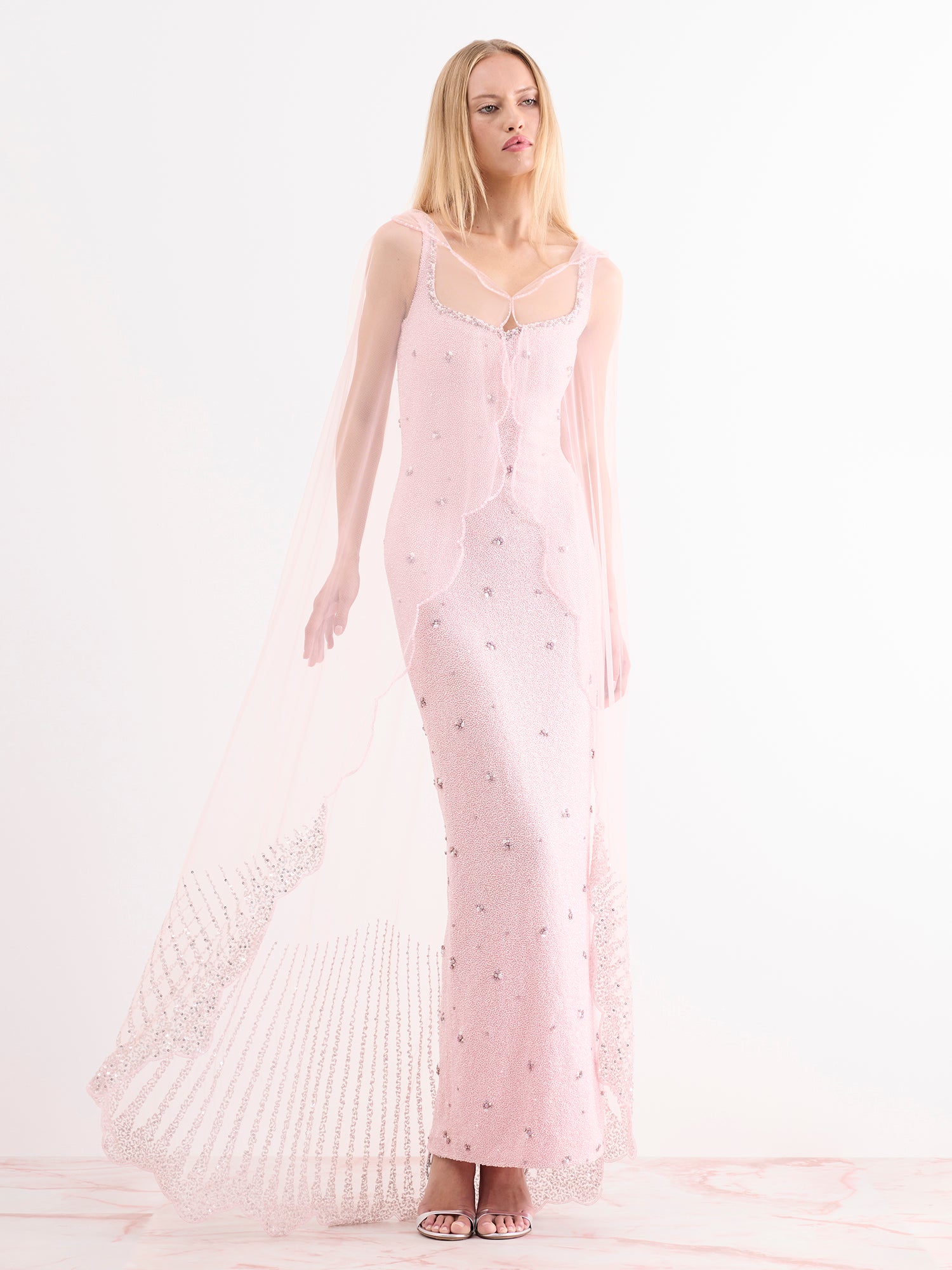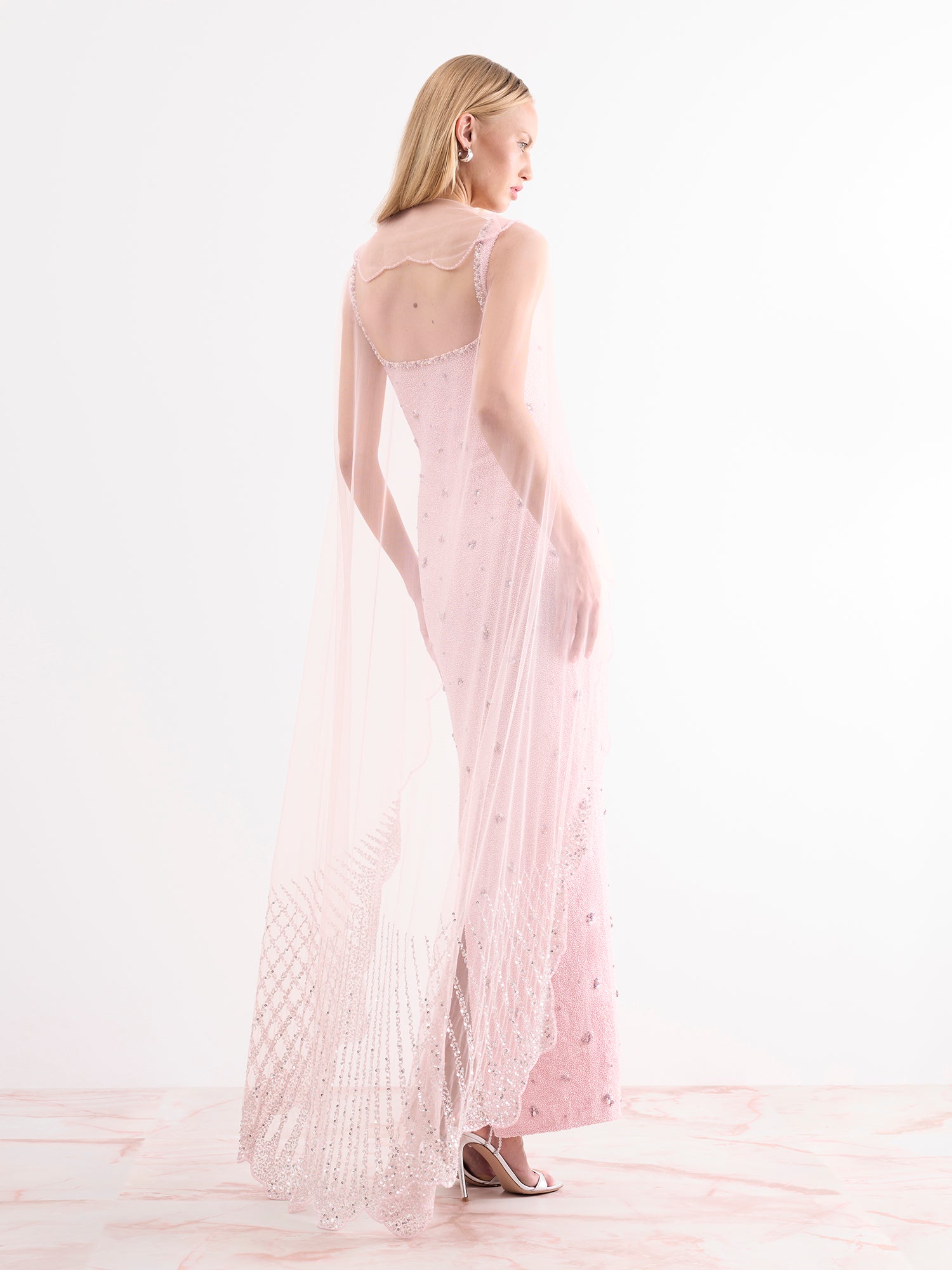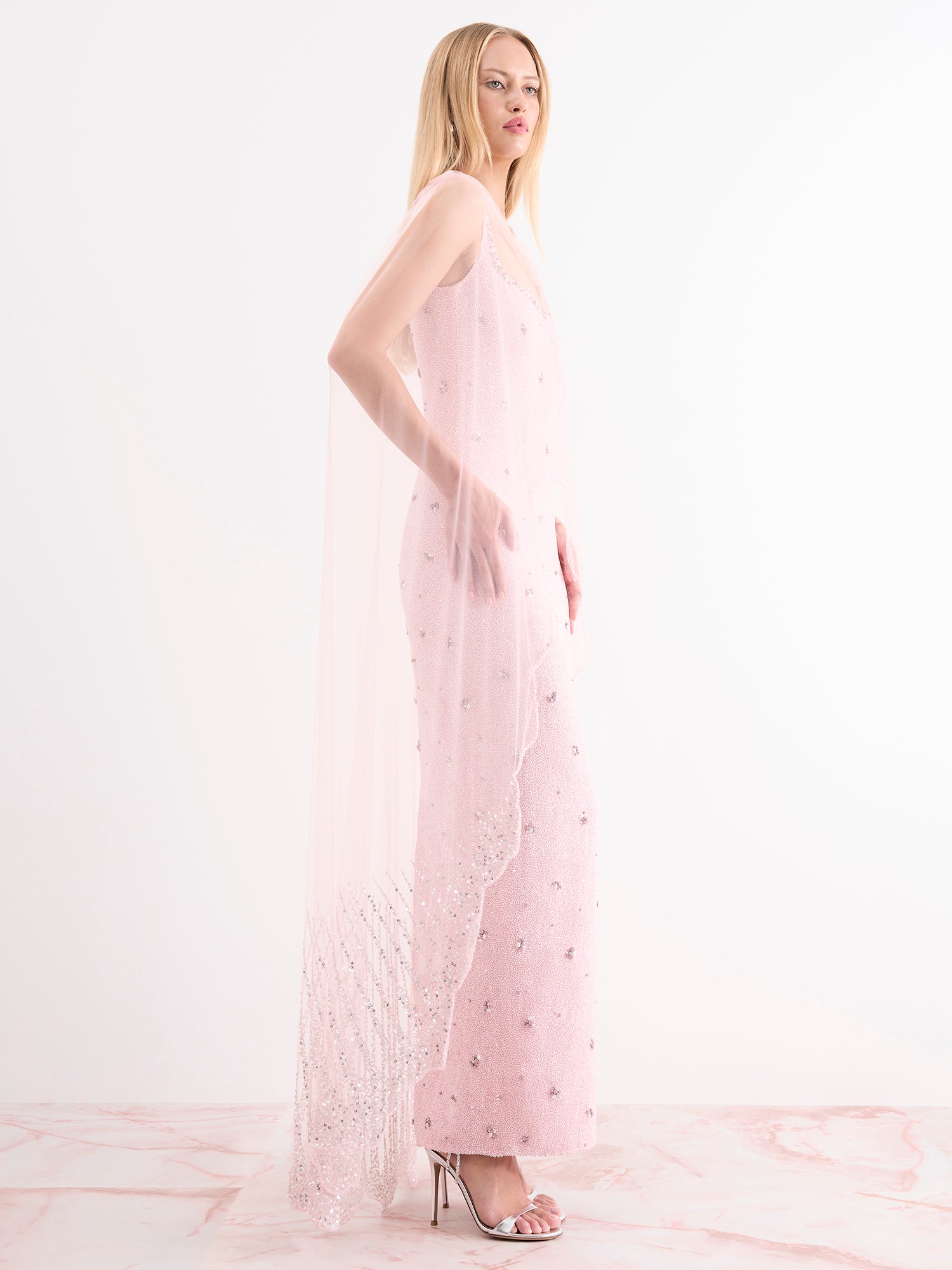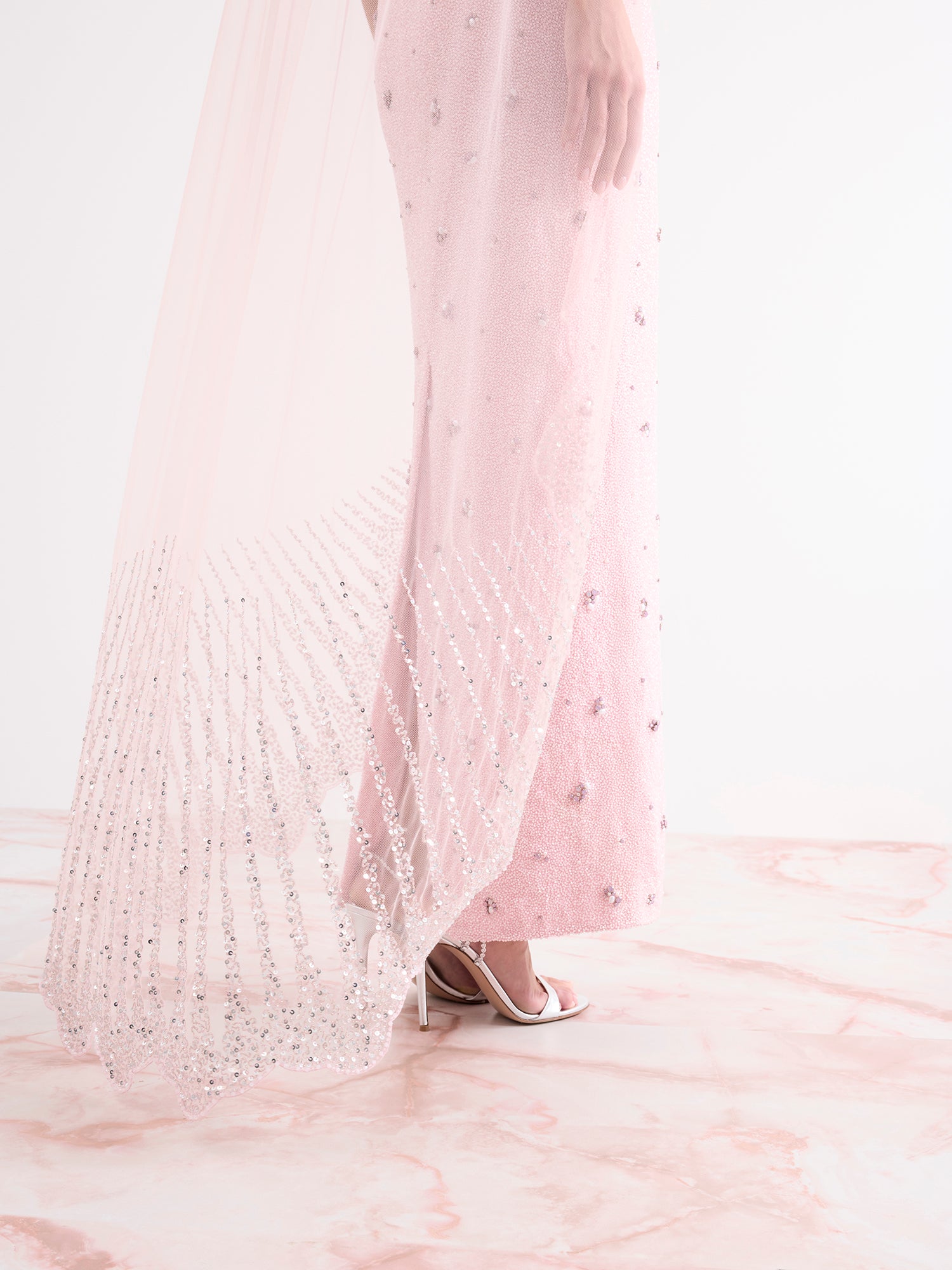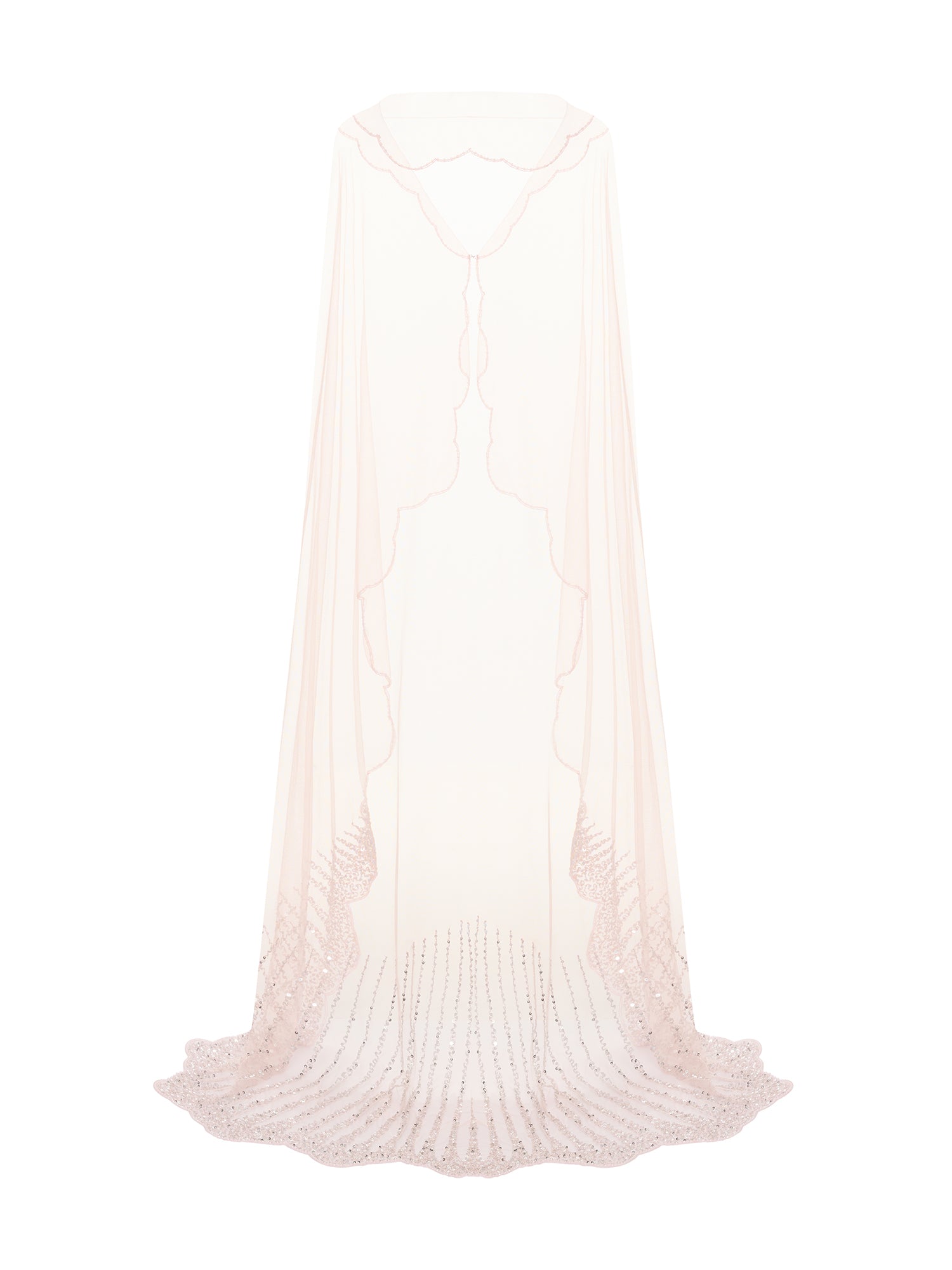 The Moonray Cape in embroidered tulle captures the magic of moonbeams glittering through a midnight sky. The dramatic floor-length cape features a delicately scalloped detail and intricate embroidery which shimmers upwards from the hem. The cape pairs perfectly with the Sophia and Selene dress in matching rose hues.