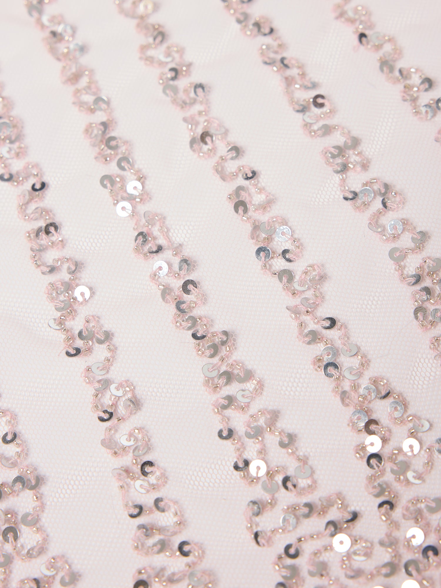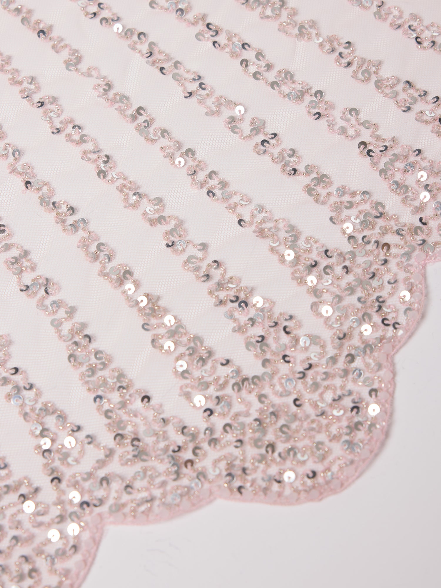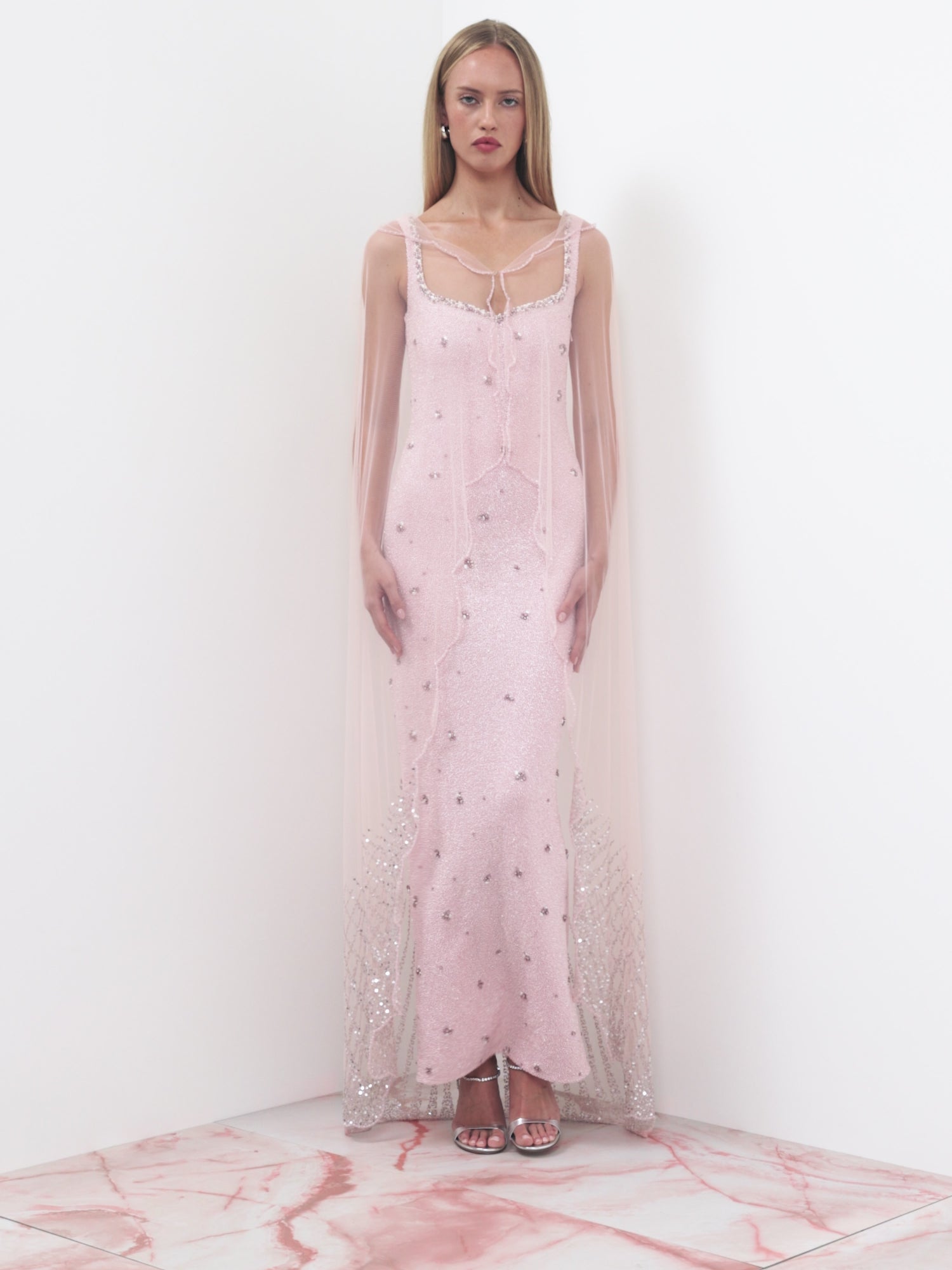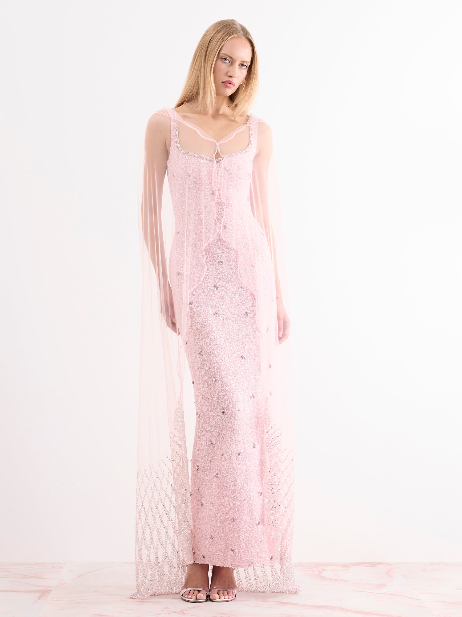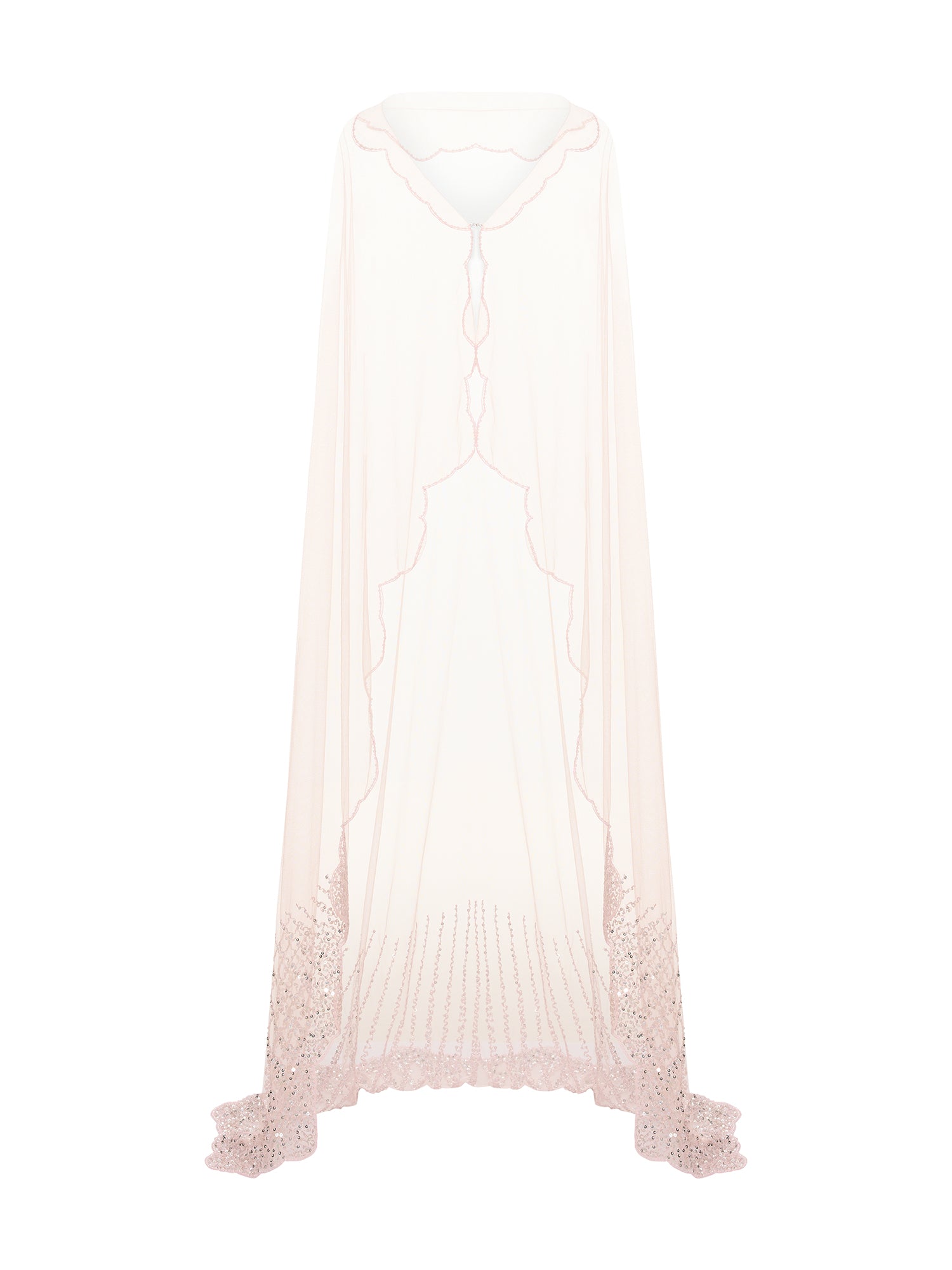The Moonray Cape in embroidered tulle captures the magic of moonbeams glittering through a midnight sky. The dramatic floor-length cape features a delicately scalloped detail and intricate embroidery which shimmers upwards from the hem. The cape pairs perfectly with the Sophia and Selene dress in matching rose hues.