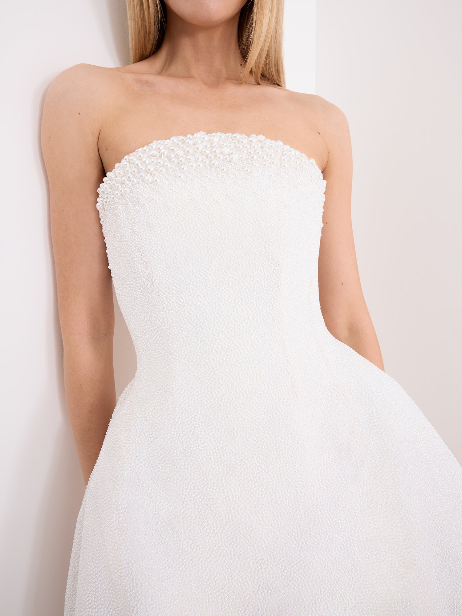 Meet the Olympia Mini Dress. Hand crafted from luxurious stretch crepe, the Olympia mini dress is fully corseted with internal boning and additional internal support for the most secure and flattering fit. Featuring a bell shape structured skirt, the Olympia Mini has voluminous hips with an added silk frill hemline that flatters and exaggerates an hour-glass silhouette. Hand embellished with fresh water pearl beads that transcend along the crescent shaped neckline and descends into the body of the dress.