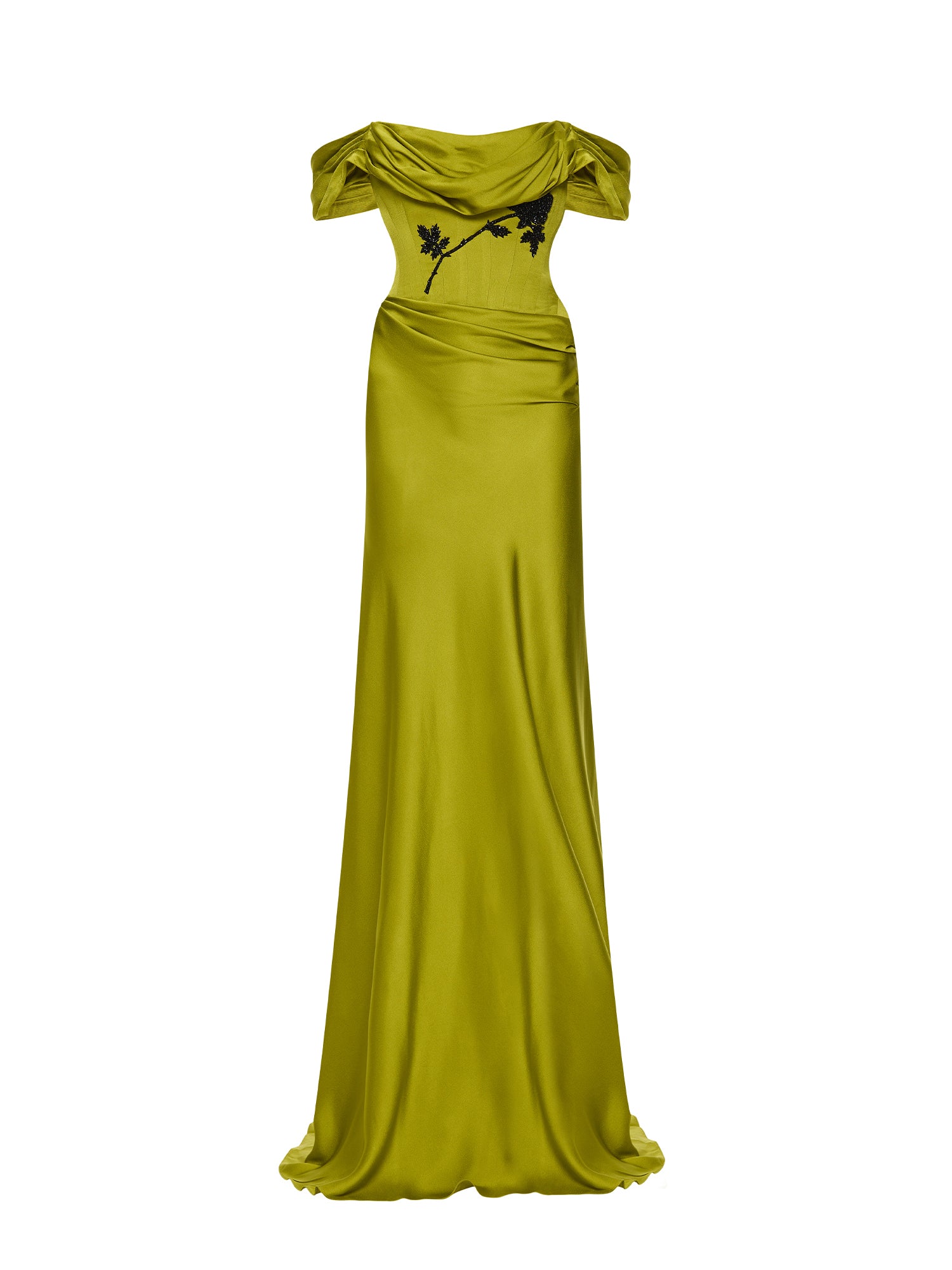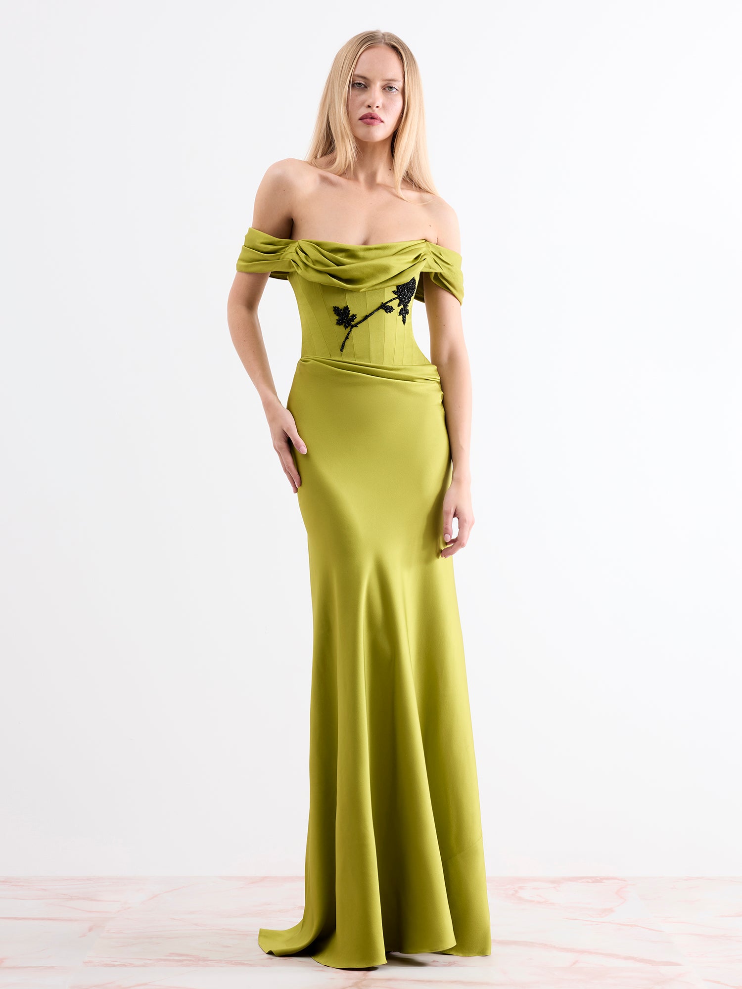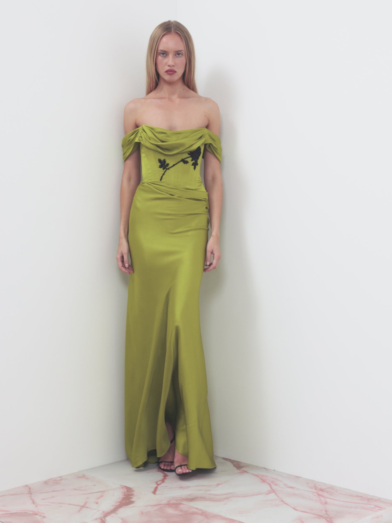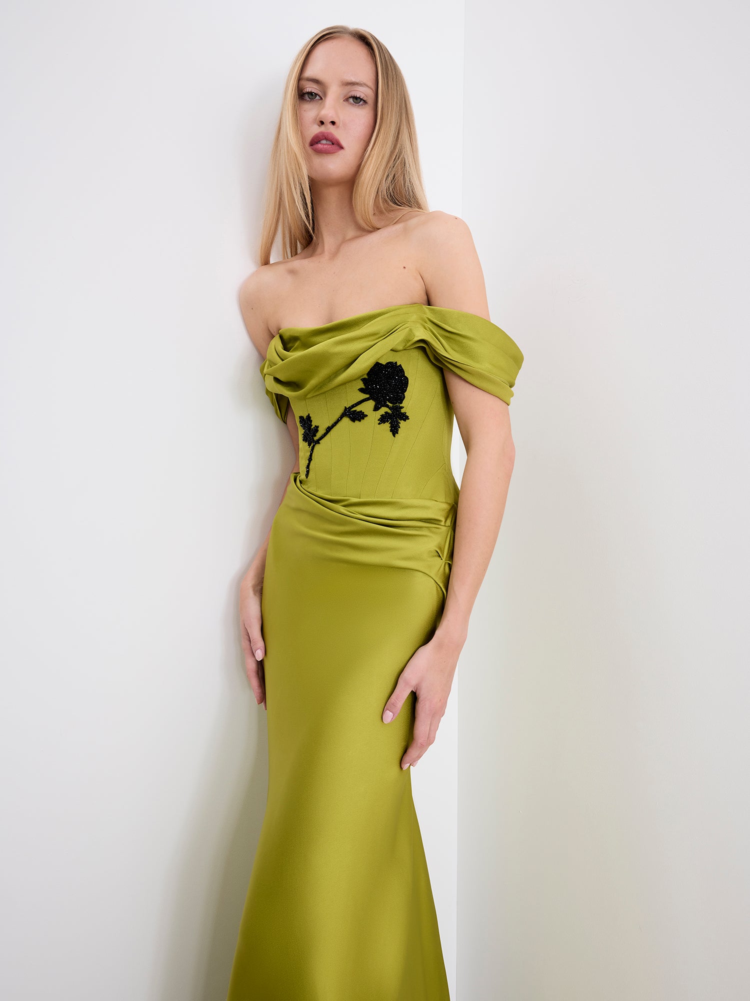 The Paloma Dress is timeless and feminine, cutting a sleek and sculptural silhouette in a vibrant chartreuse satin. Designed with a fully functional corset with embroidered rose motif which flows into a captivating draped skirt, the Paloma blends classic couture elements with contemporary allure.