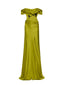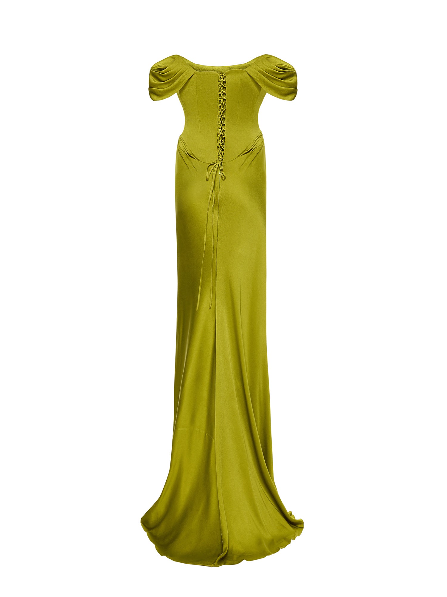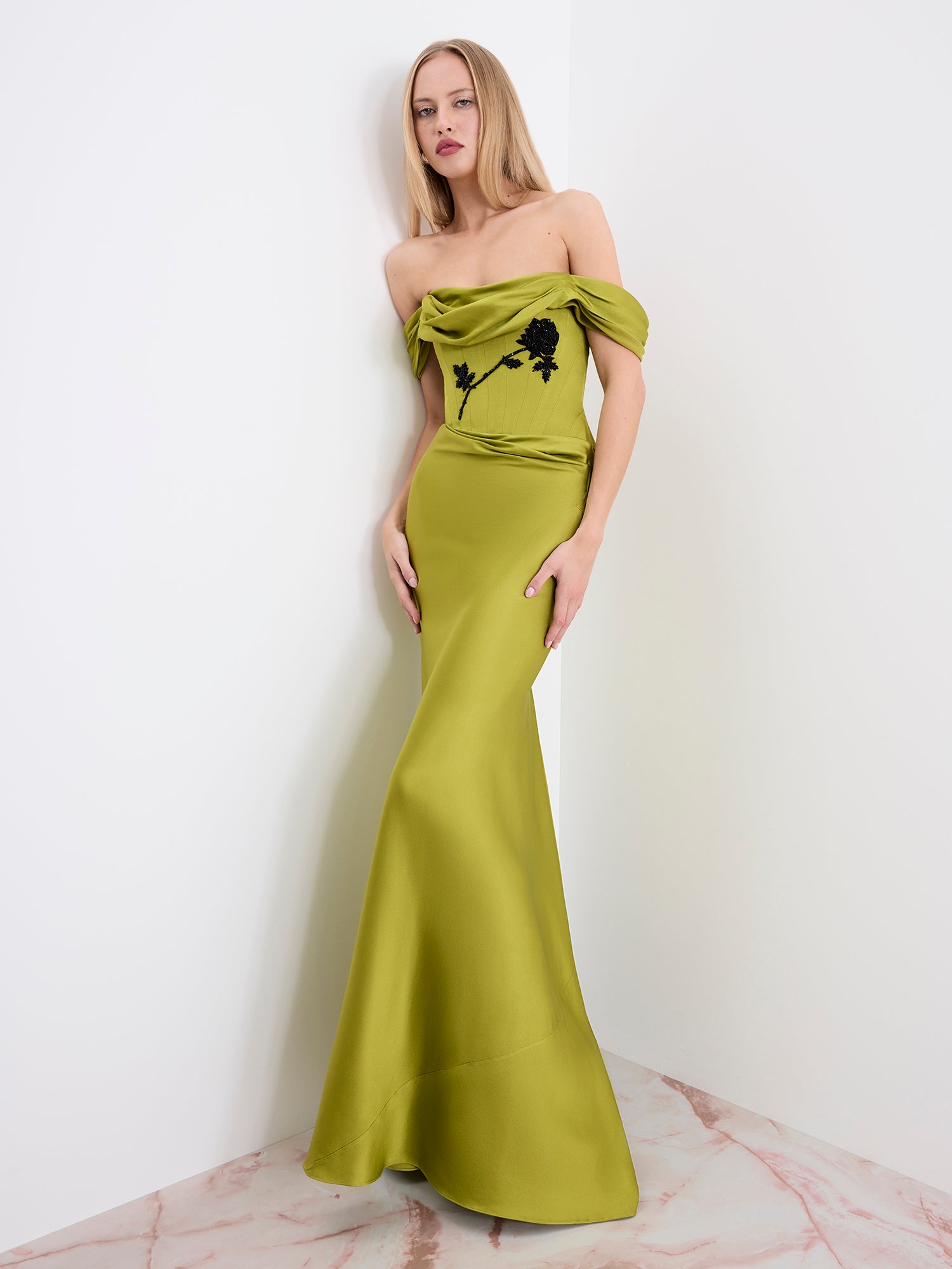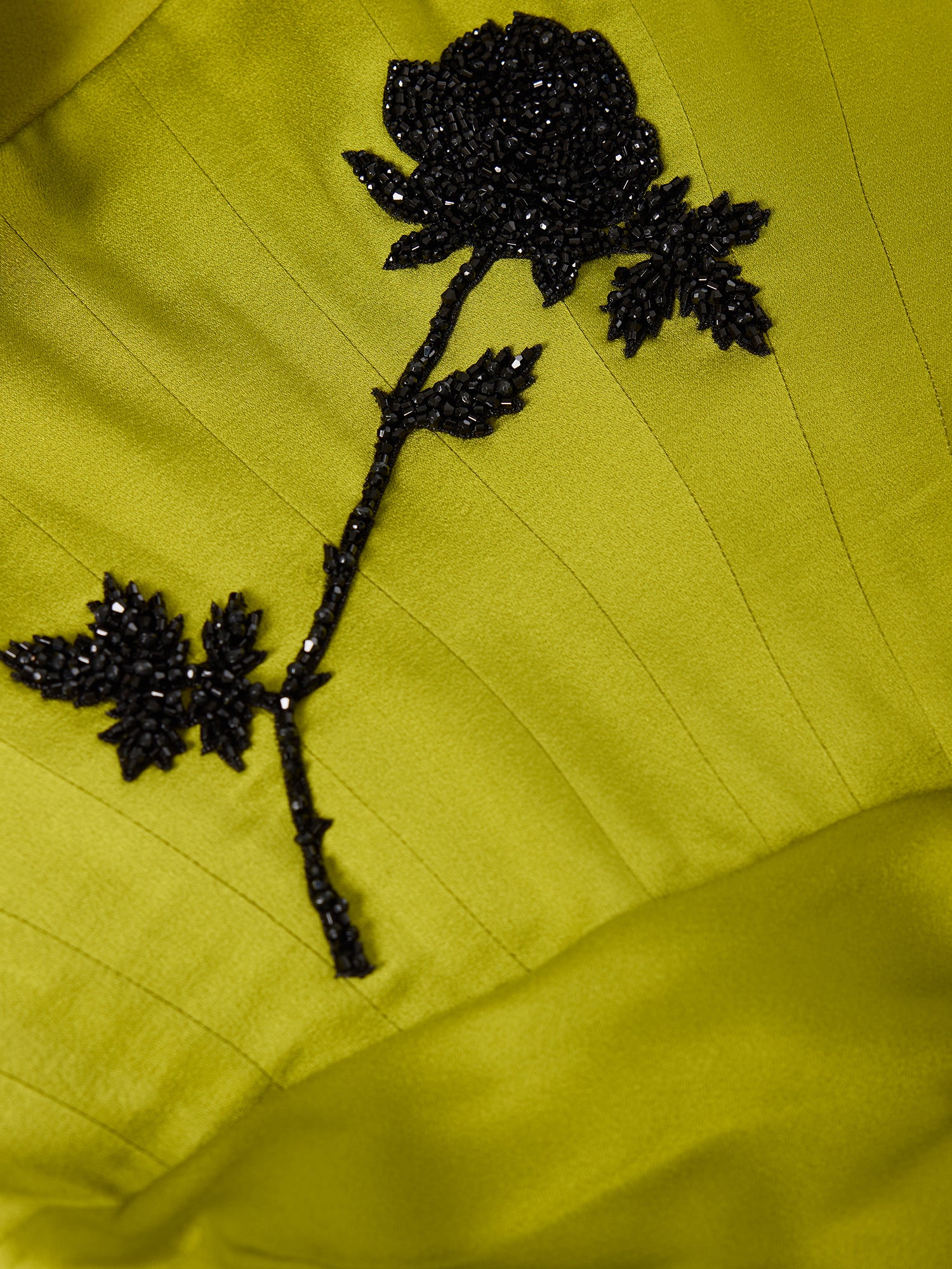 The Paloma Dress is timeless and feminine, cutting a sleek and sculptural silhouette in a vibrant chartreuse satin. Designed with a fully functional corset with embroidered rose motif which flows into a captivating draped skirt, the Paloma blends classic couture elements with contemporary allure.