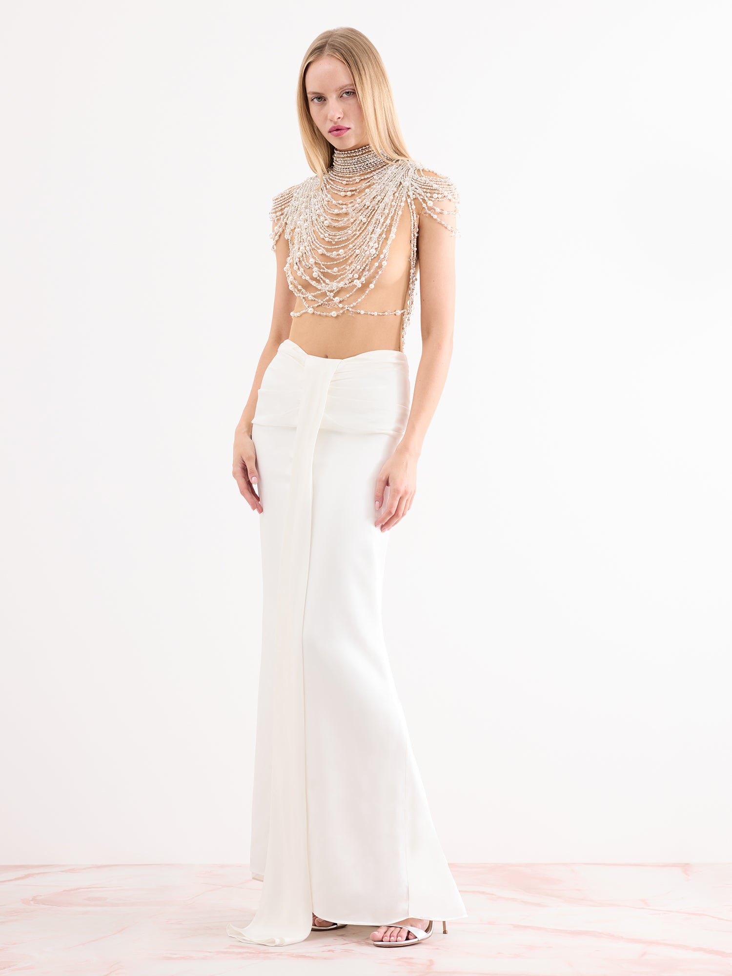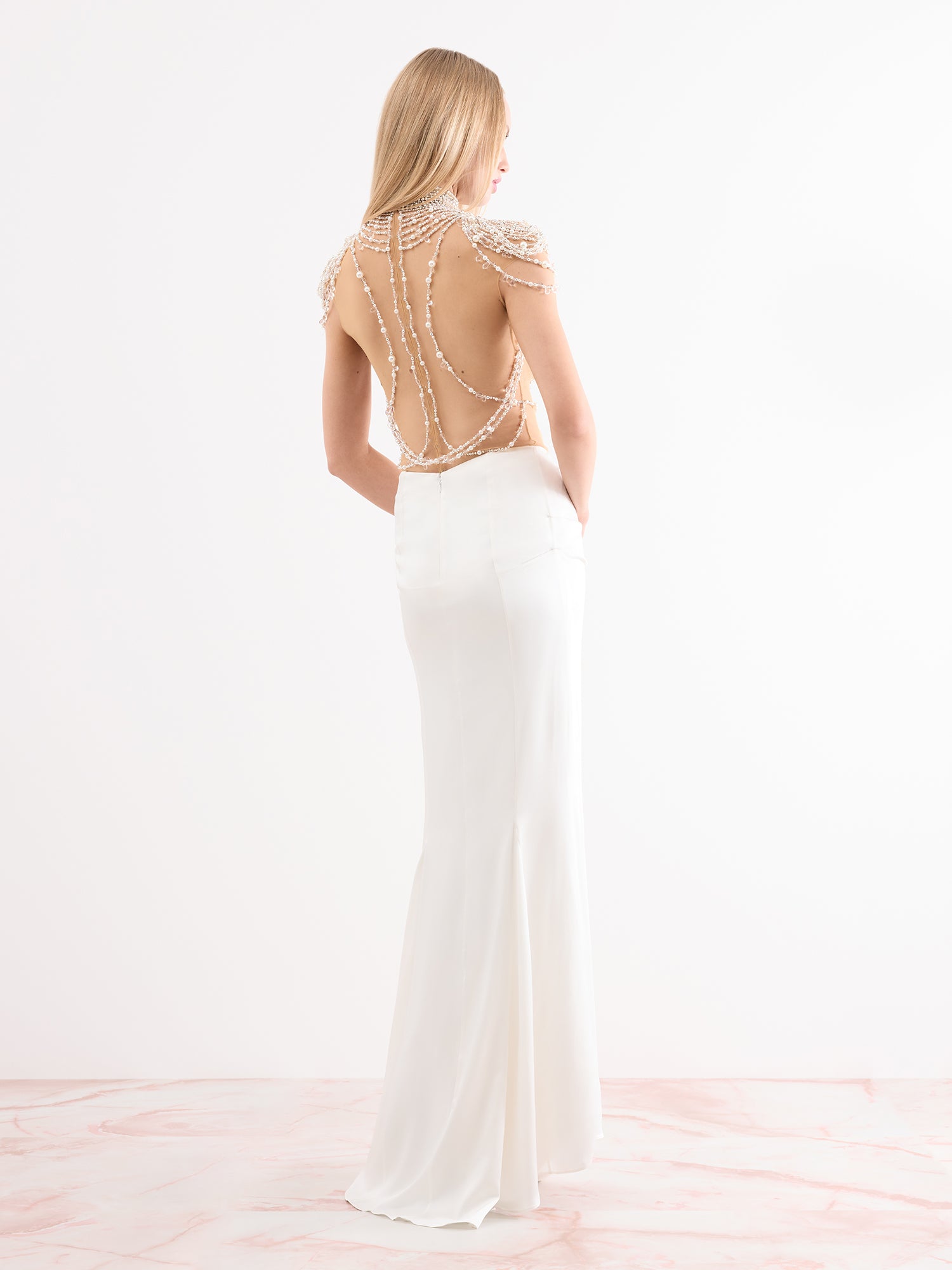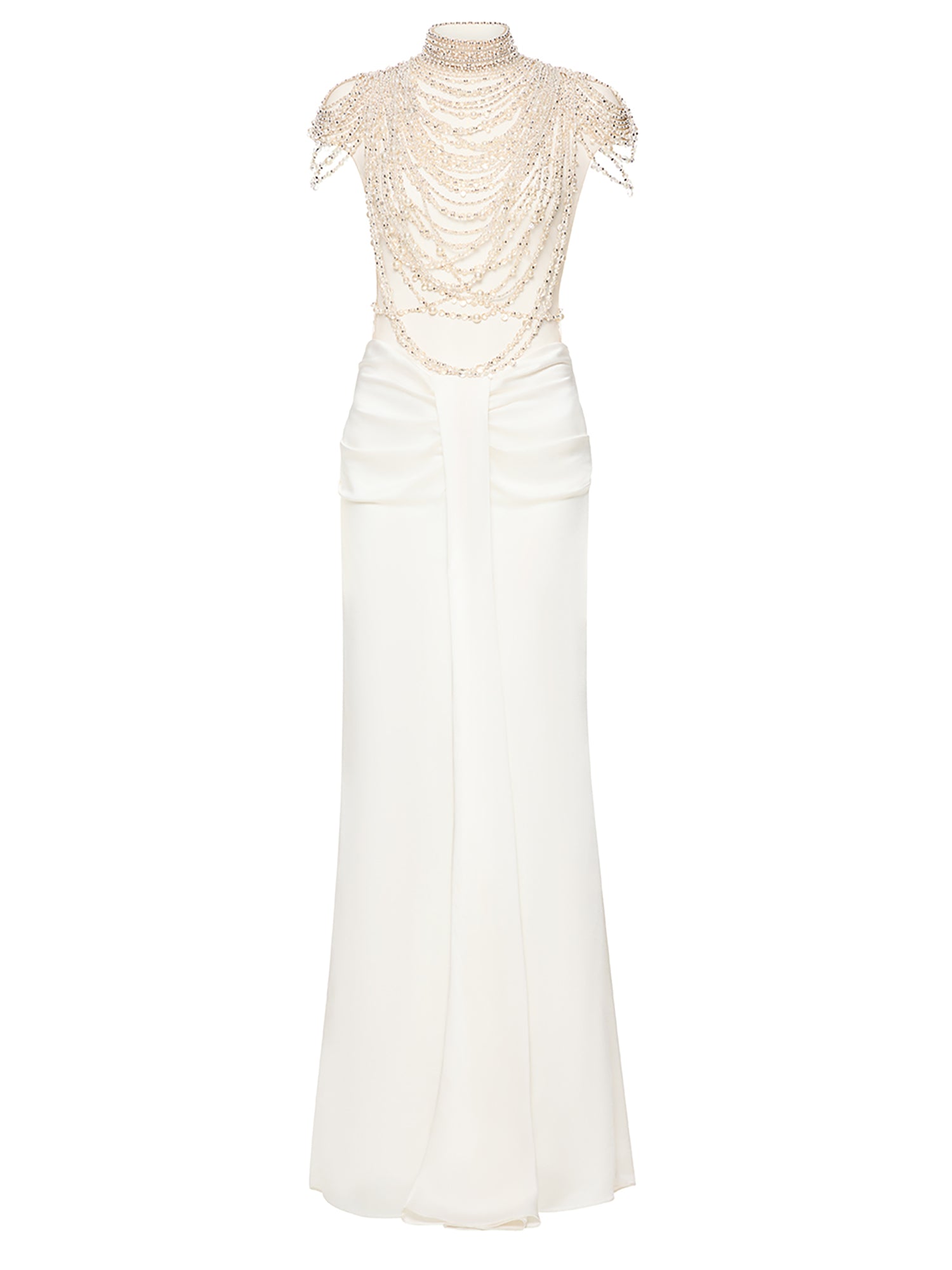 Capture the essence of old-age Hollywood glamour in the Zsa Zsa. Pearls drape across the sheer bodysuit like stacked necklaces, whilst the skirt beautifully gathers, accentuating the waist. A look designed for red-carpets, and which can't help but command attention.