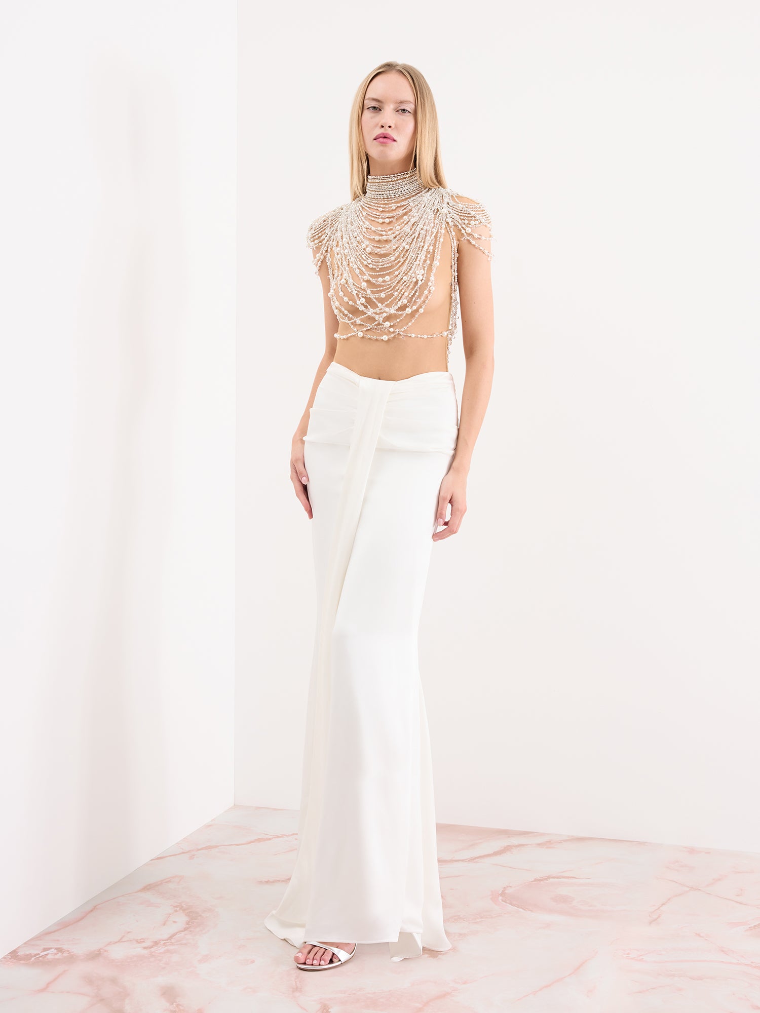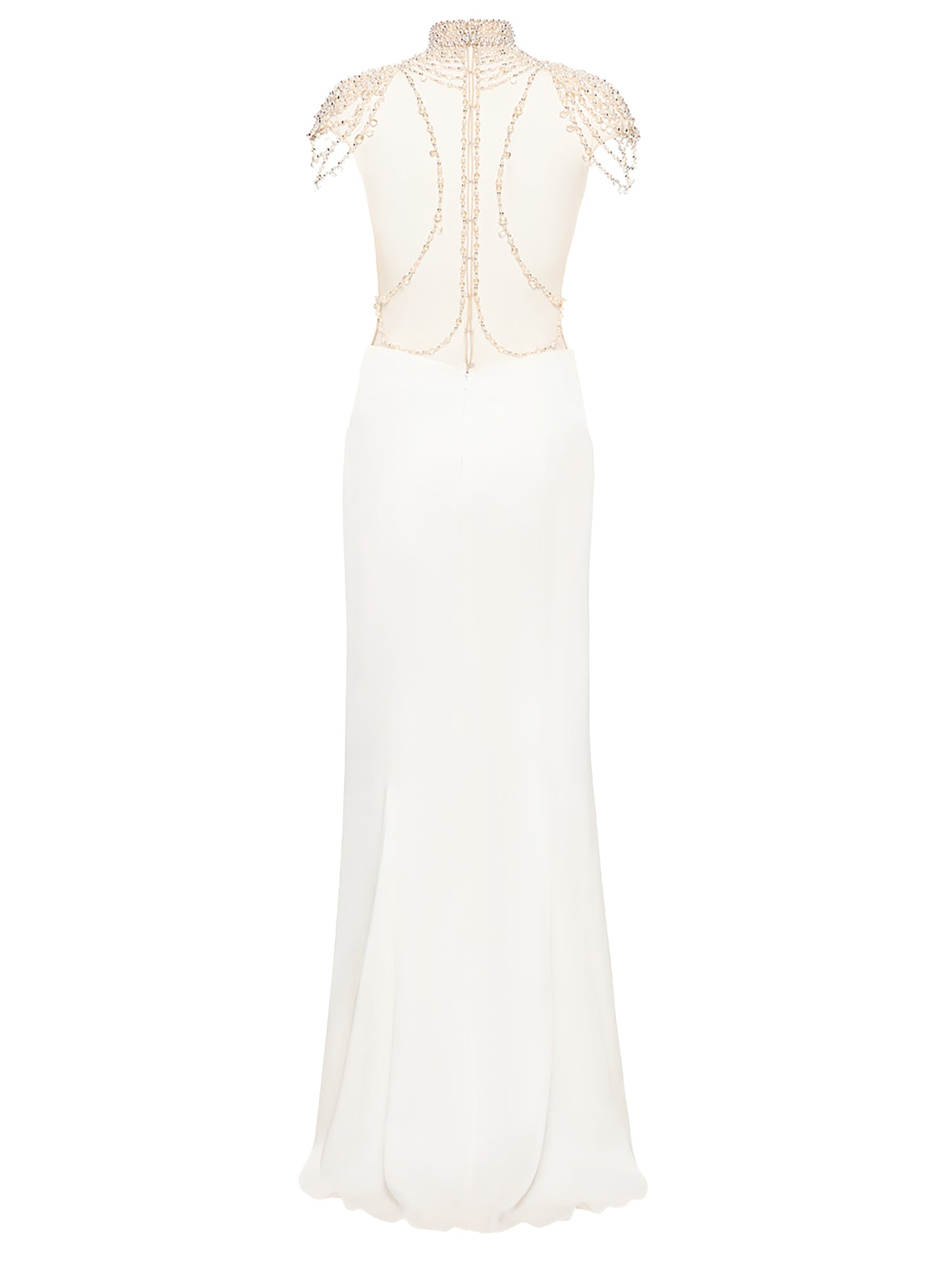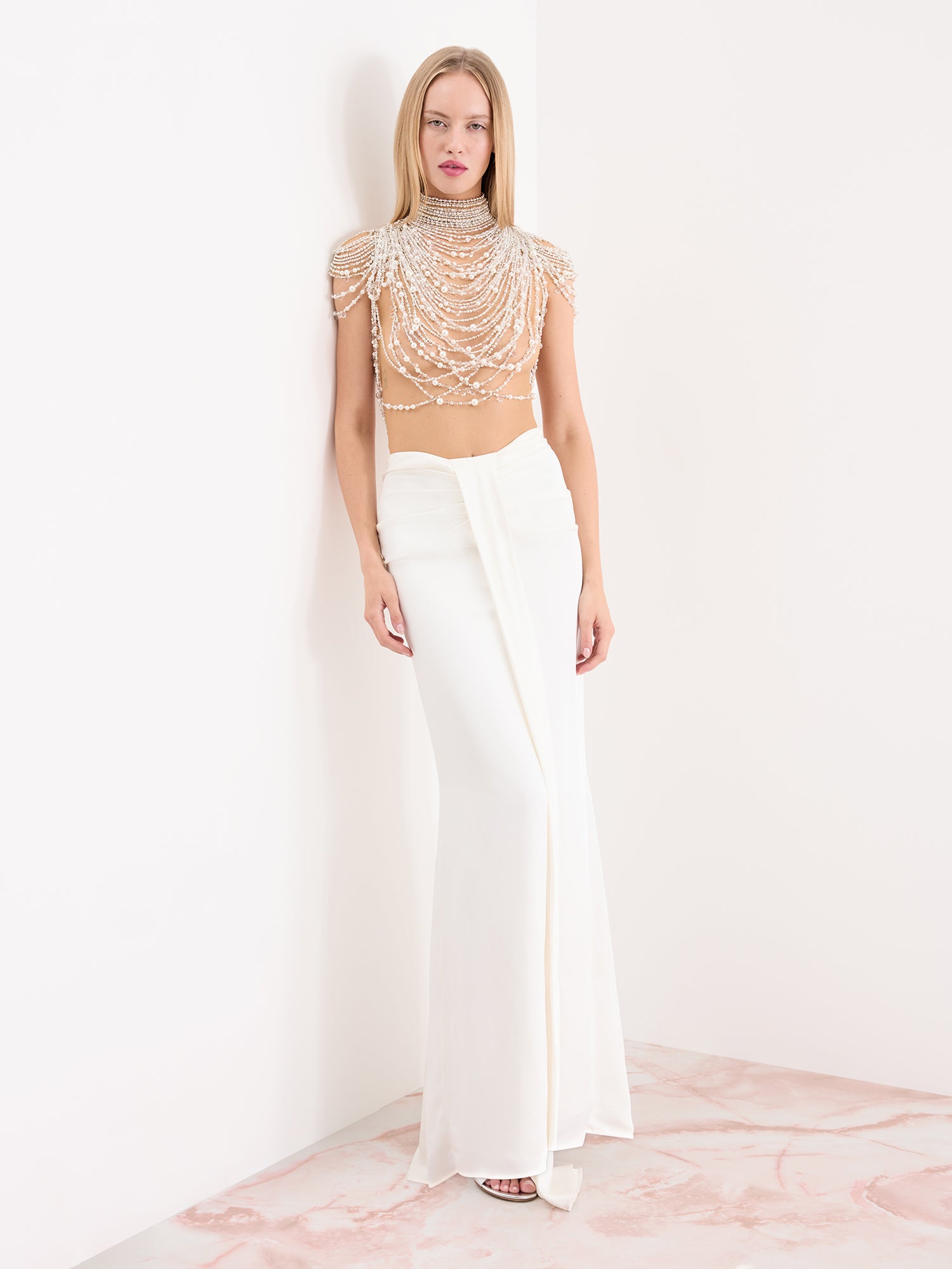 Capture the essence of old-age Hollywood glamour in the Zsa Zsa. Pearls drape across the sheer bodysuit like stacked necklaces, whilst the skirt beautifully gathers, accentuating the waist. A look designed for red-carpets, and which can't help but command attention.